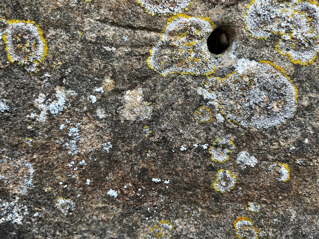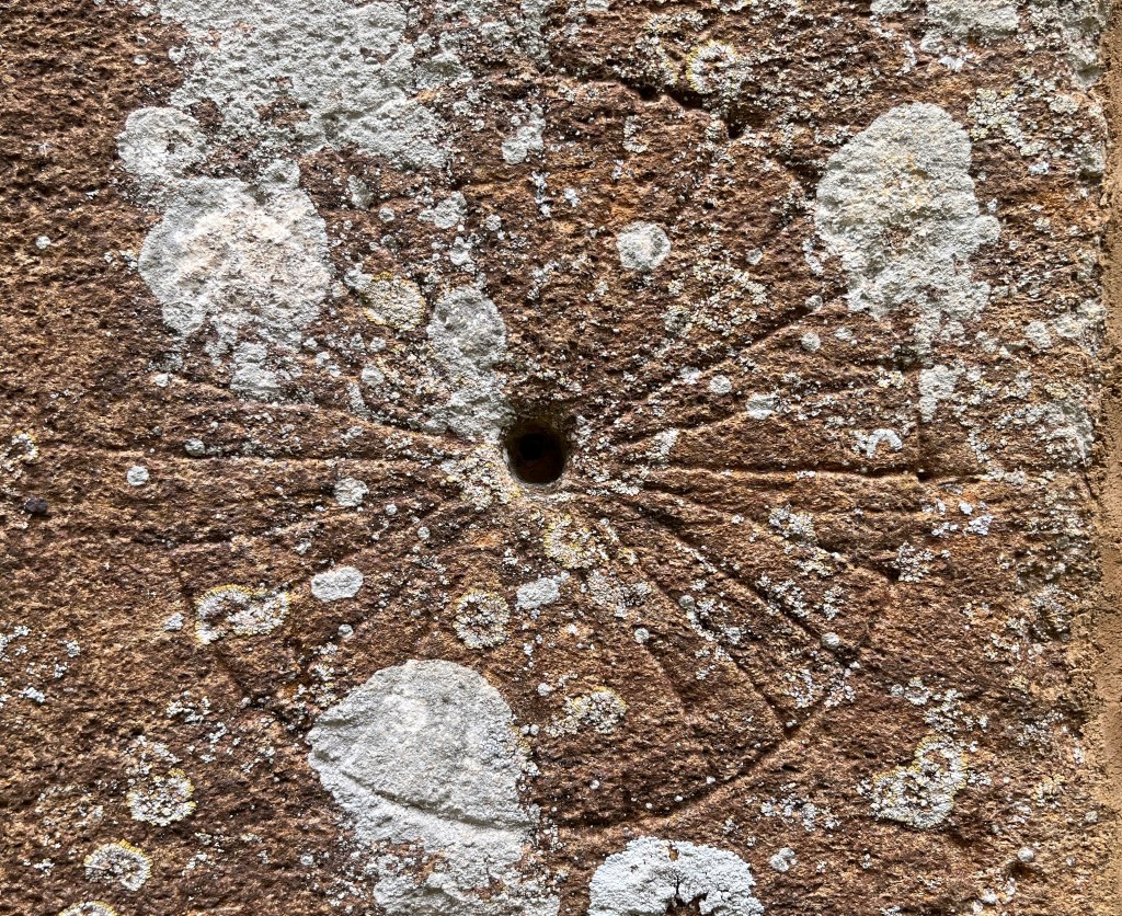 A very basic dial with the gnomon hole in the mortar line. Two clear lines either side of noon, possible terminal pocks (if so, perhaps later additions). LLQ there’s a faint trace of a third line.