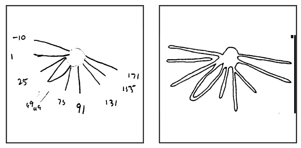 Located on the S wall near E window, a small single dial with 10 lines radiating from a fairly large style hole. C15. Of particular interest is that, most unusually, 2 of the lines meet at their outer ends (GLP) or even cross (BSS). The angled shot shows it best – and see diagram below. GLP suggests this arrangement roughly coincides with the Mass time Terce (9h) and may emphasise it, as a pock or a deeper cut radial might.