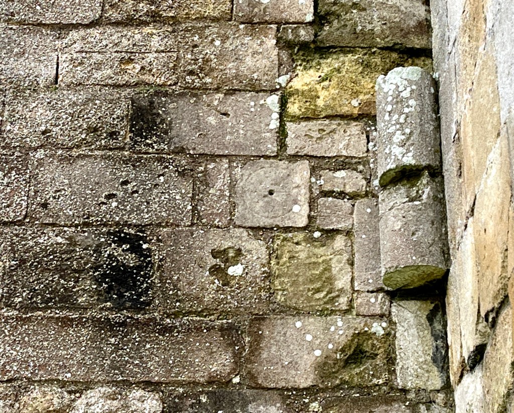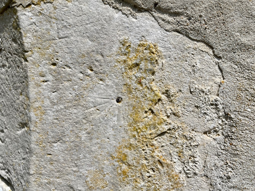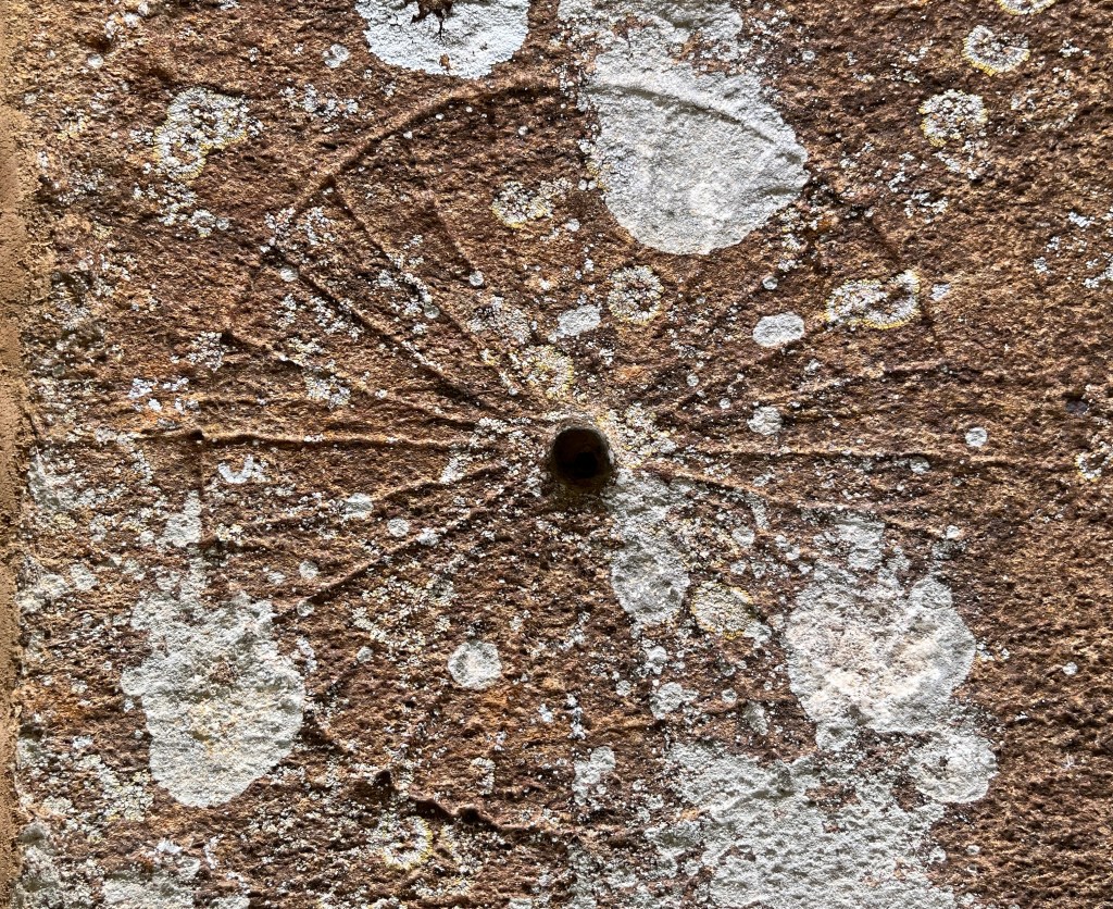 In the top R corner is a quite different type of dial, semi-circular with several lines and circumference pocks that more or less match hour line positions. It strays onto the adjacent quoin stone and there’s an impression that it might once have had a top half, with the stone later replaced.