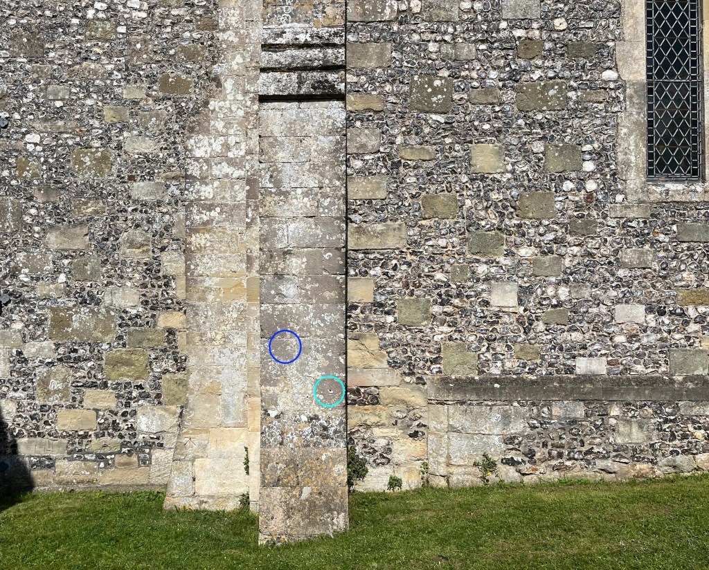 A while ago, I featured a dial, not previously recorded, on the SW face of the LHS buttress by the entrance door. We live close to St Mary but I had never noticed the dial until I saw it in direct evening sunlight, spotting the filled gnomon hole first (see below).