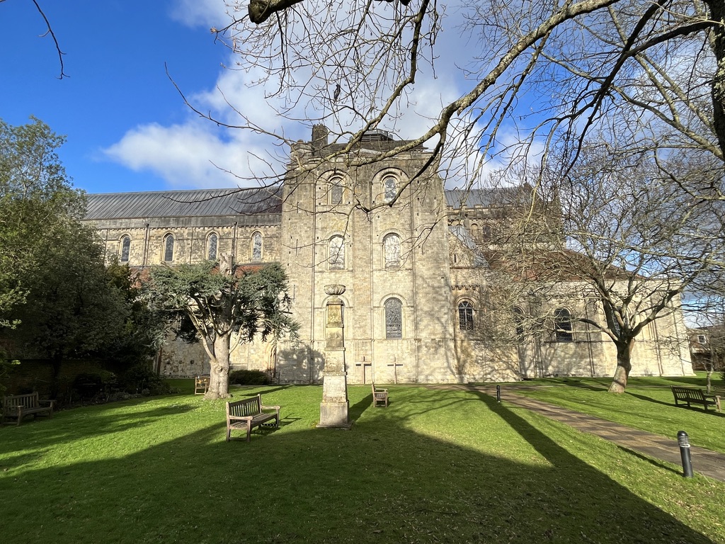 In a format variation, I will side-step the usual scene-setting para. In comparison with its host building, the somewhat elusive scratch-dial is an infinitesimal part. It is quite rare, I think, to find a scratch dial on a cathedral, abbey, or other major church building. Romsey has one that would be easily overlooked without clues. Next time I’m in Romsey I’ll take a proper camera on a sunny day.