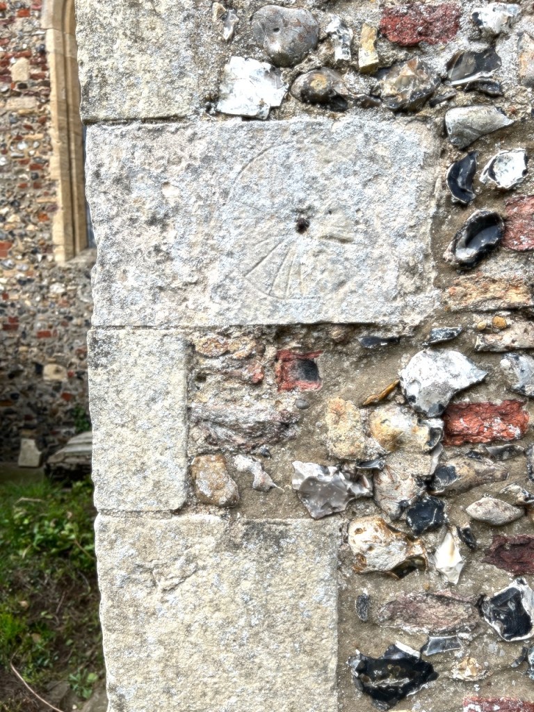 A simple time marker centred in the dial stone, from an earlier period. 2 lines are visible L side. Probably that was all that was required in (say) C13, in simpler times and before the church had developed. The position of the lines suggests that None was the (main) service time.