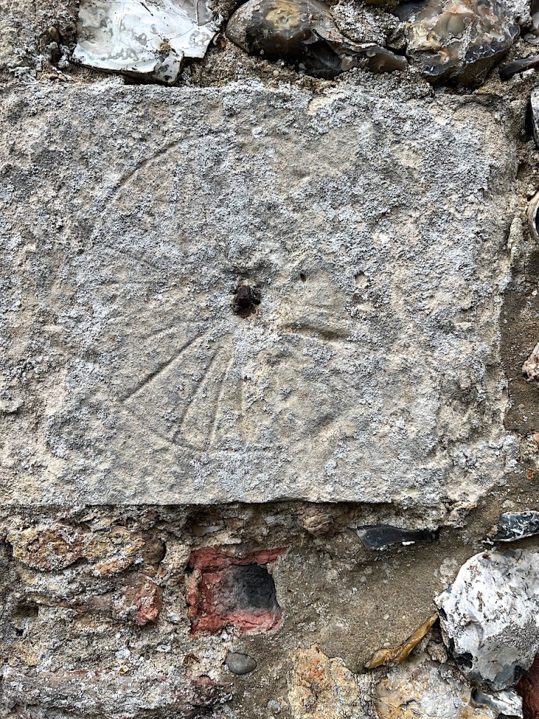 Dial 2 has 12 lines radiating from a plugged gnomon hole. There are no pocks. There’s minor puzzle: which is the noon line? The deepest cut line is the seventh line from the LHS horizontal rather than the sixth, and slightly offset to the right. In addition, 3 or 4 lines seem cut off at the mortar line, suggesting a rearrangement of the stonework at some time. (It might also explain why Dial 1 is so low down on the buttress).