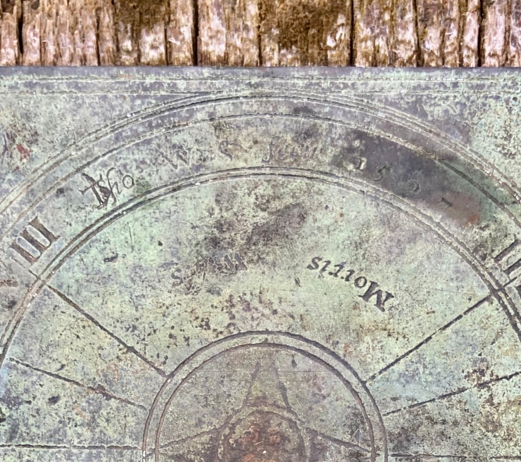 As I researched this dial it soon became clear that it had undergone considerable recent restoration. The Brookes / Stanier booklet (L) was published c2000, with this illustration. The BSS entry (R) was made in 2007, and the dial’s condition seems to have worsened. At some stage I hope to find out more.