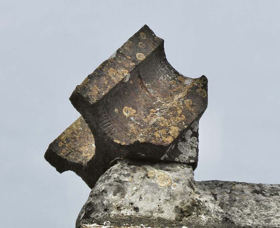 BSS Record:The hours use XII for noon and IIII for four pm, and VI, VII and VIII am are written backwards (round the clock’), as is not uncommon. Around the gnomon are carved I HT S / WARDNES / 1653, the W of WARDNES being superimposed Vs, and the letters NE being conjoined, both presumably to save space.