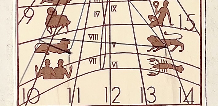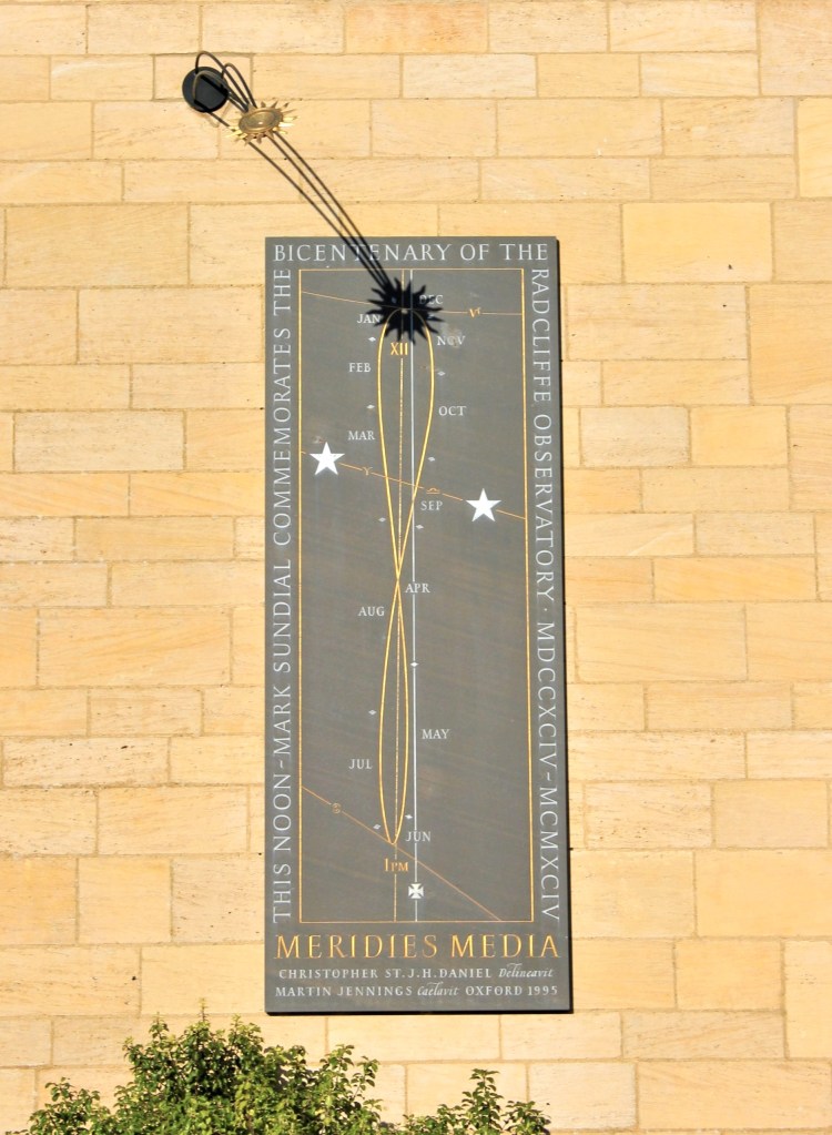 King’s College is one of the best-known Cambridge colleges, not least because of its pre-eminent choral music tradition. This fine dial is on the right side of the Chapel porch. The hour lines and numerals are painted in black directly onto the stone. The gnomon emerges through a golden sunburst, matched by two gold heraldic lions in the lower corners. The dial itself dates to 1733 (BSS) and the inscription J.C. 1578 on the face is a mystery: no specific association has been matched to it.