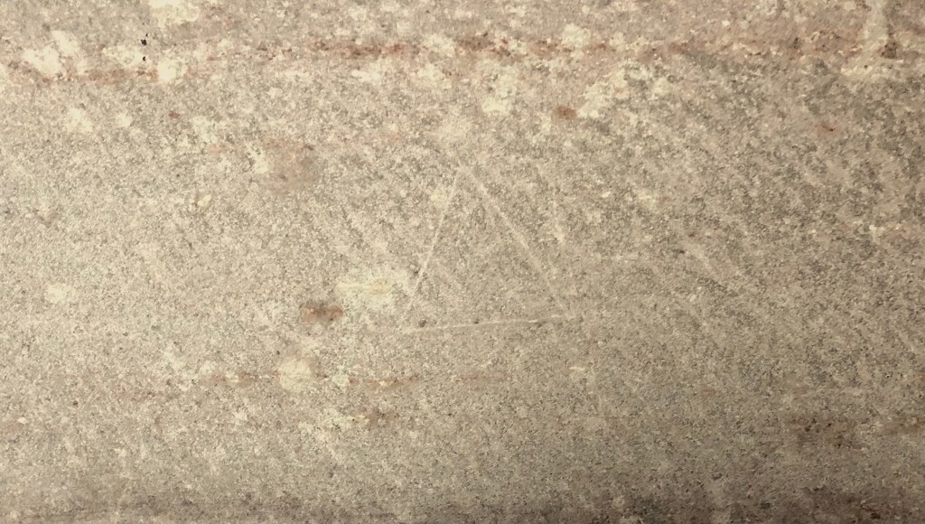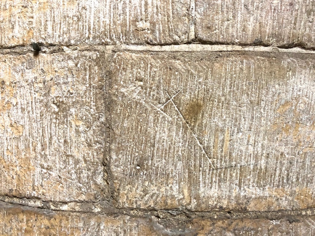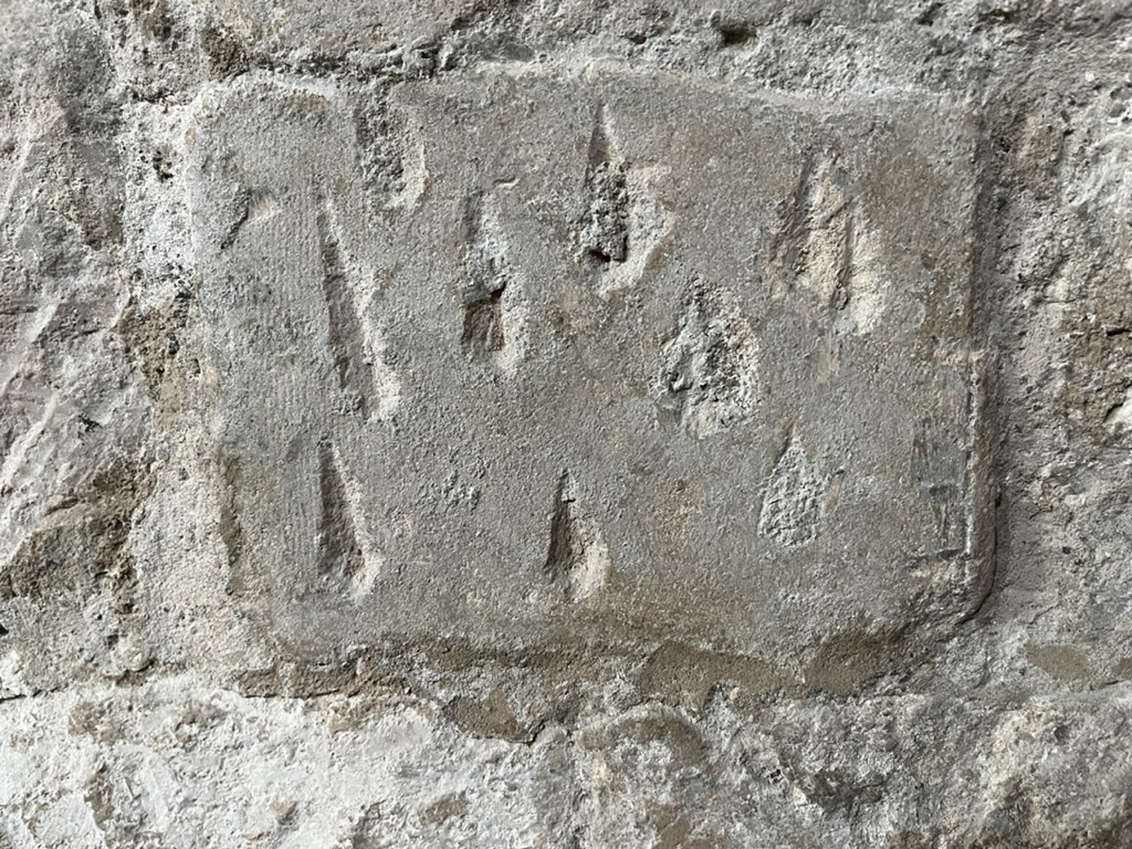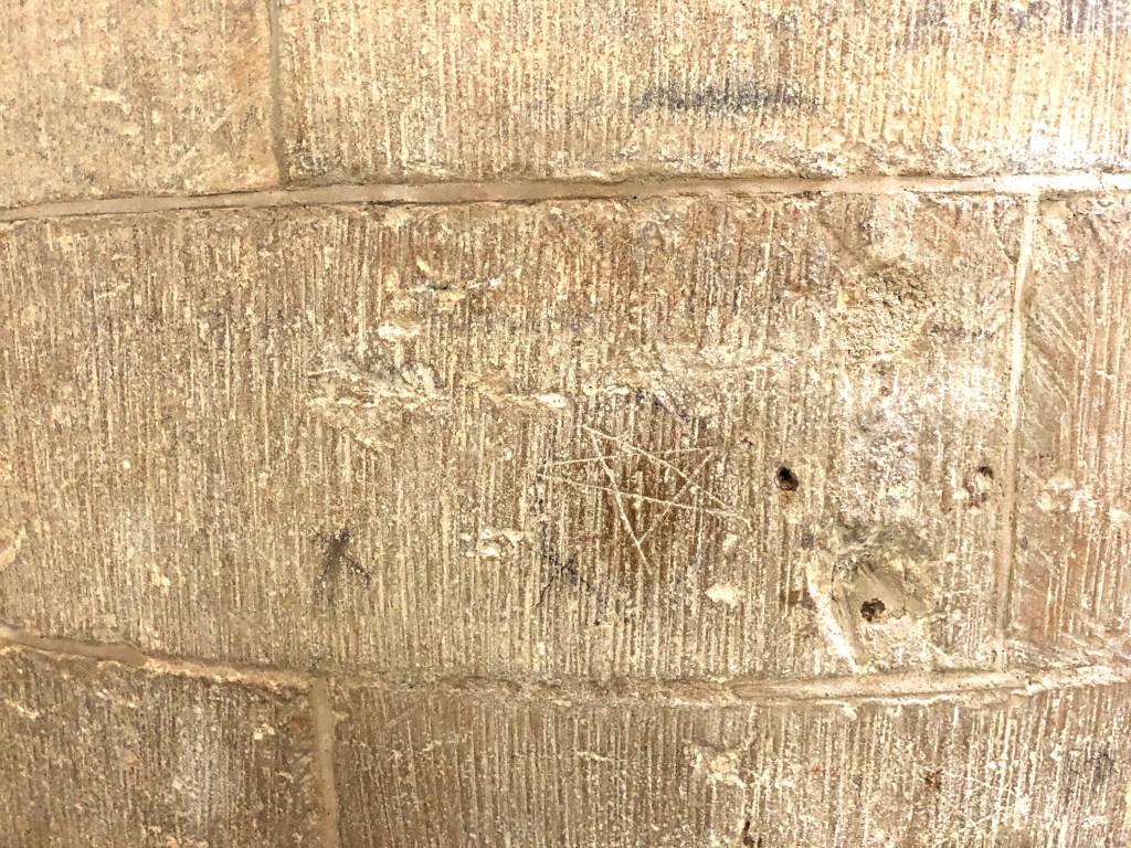 Triangular mason’s mark. There are also a number pentagrams, said to be masons’ marks rather than (as might be thought) ritual protection marks