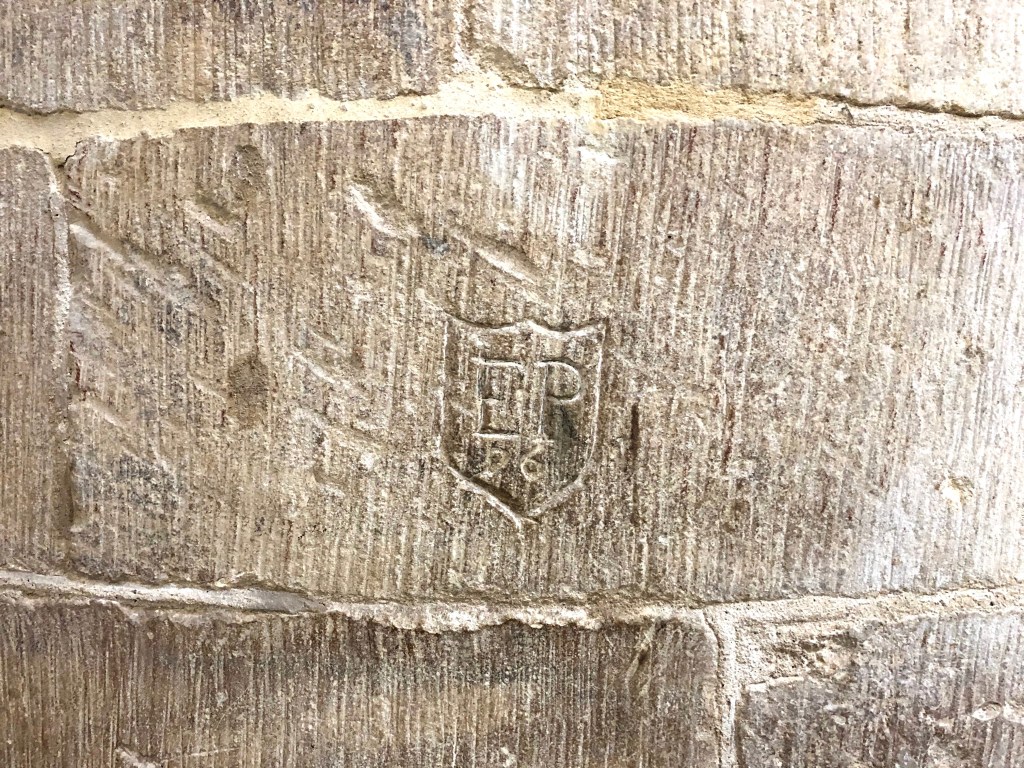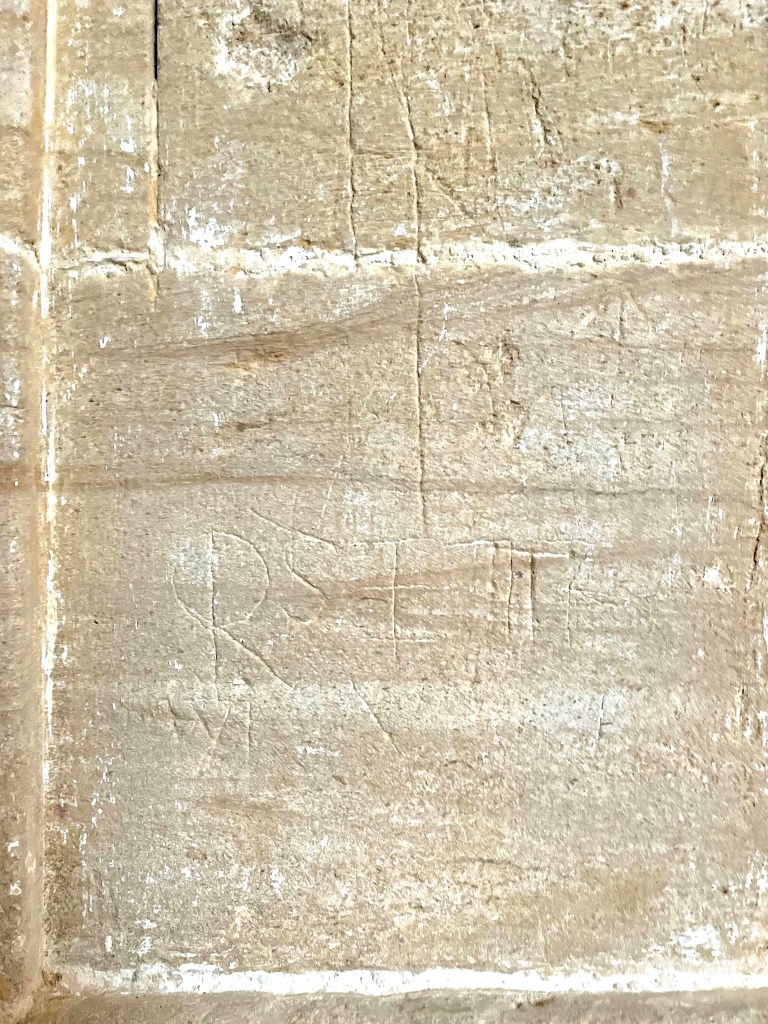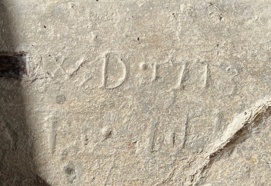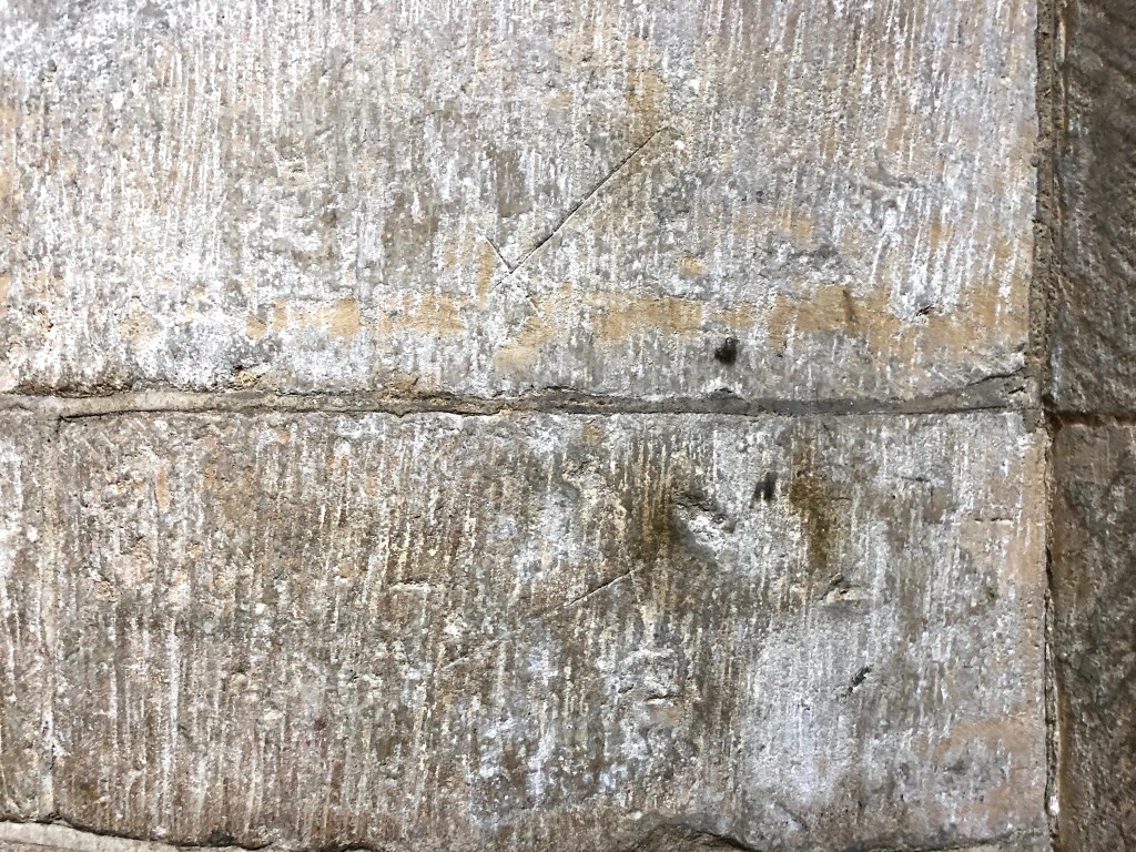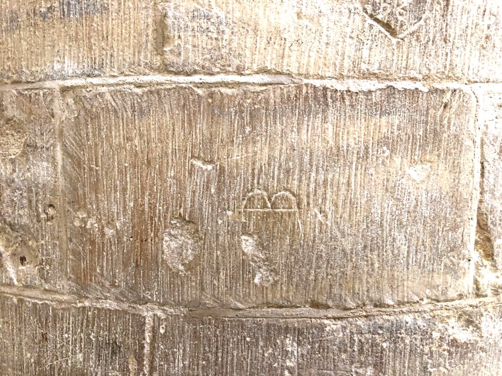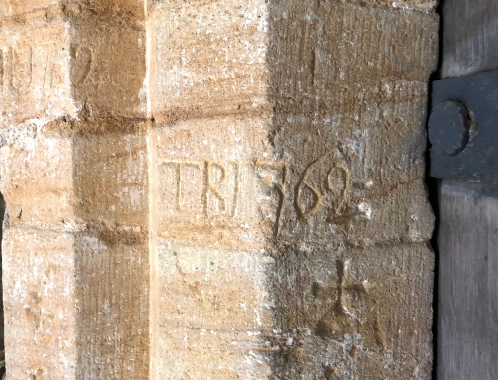 Mason’s marks / initials and dates that relate to the rebuilding of the church (except the C15 tower) in mid- C18. There are other marks, including a presumed Marian V V mark (bottom left), a ‘ritual protection mark’.