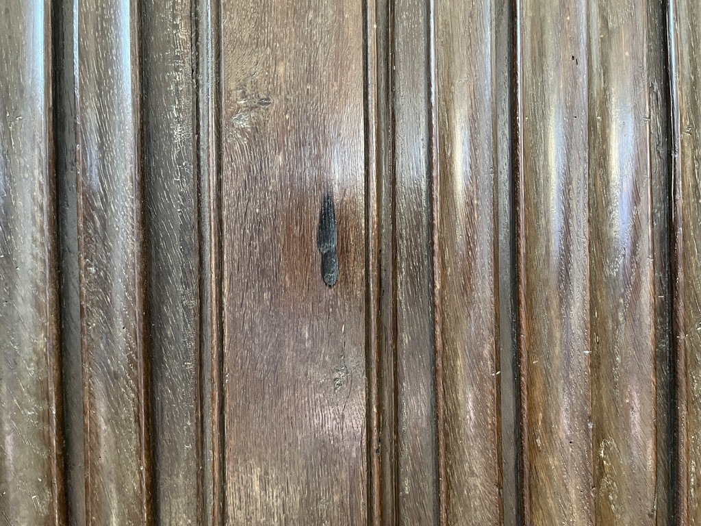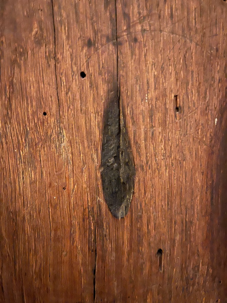 Taper marks would seldom (if ever) be seen in a church, but merit a mention in the context of witch marks. They are mainly found in medieval houses and are made by scarring wood with flame. There may be several in one location. They are found often at the entrance to a room with a fireplace, as a protection from fire as well as evil. The marks below, in a manor house, show two examples.
