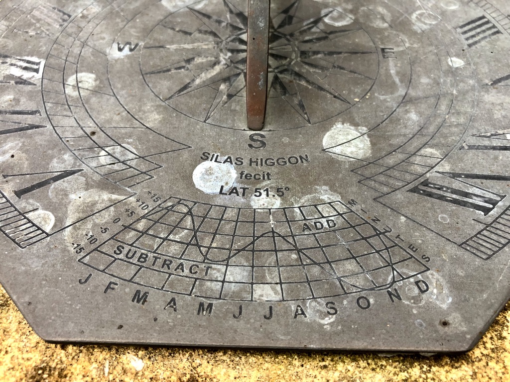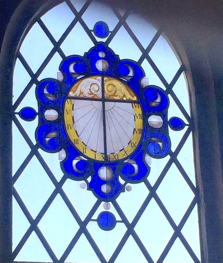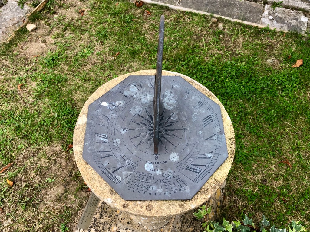 A memorial horizontal dial in the churchyard of this attractive small church made by Silas Higgon, a well-known dial-maker. It will be of particular interest to those who understand (not me) the finer details. While you admire it, look inside the porch and on RHS of the original door is a very clear scratch dial which you can read about HERE