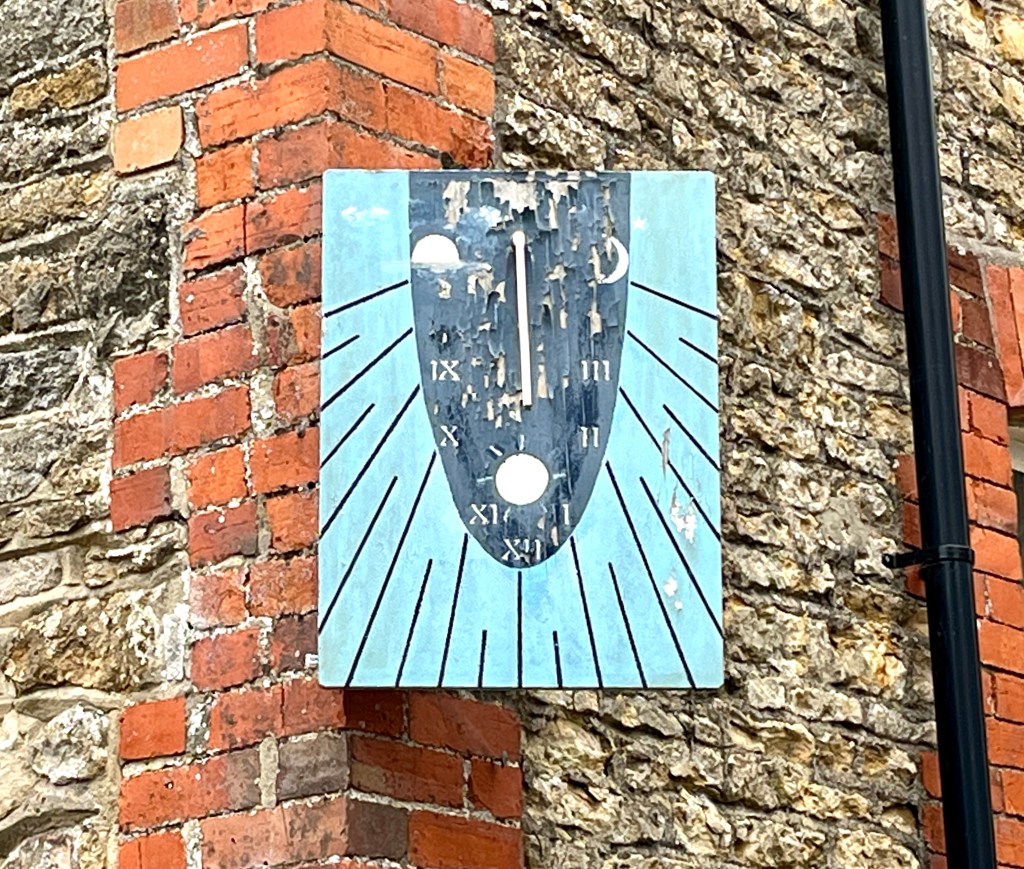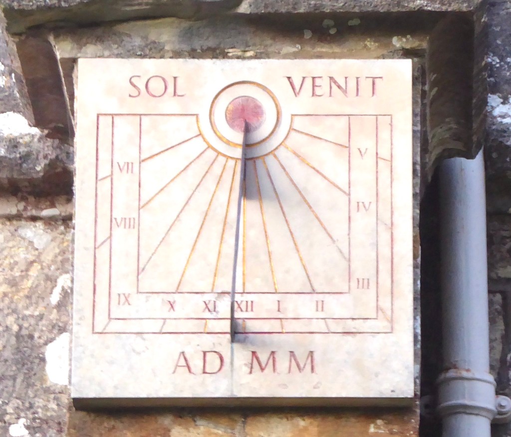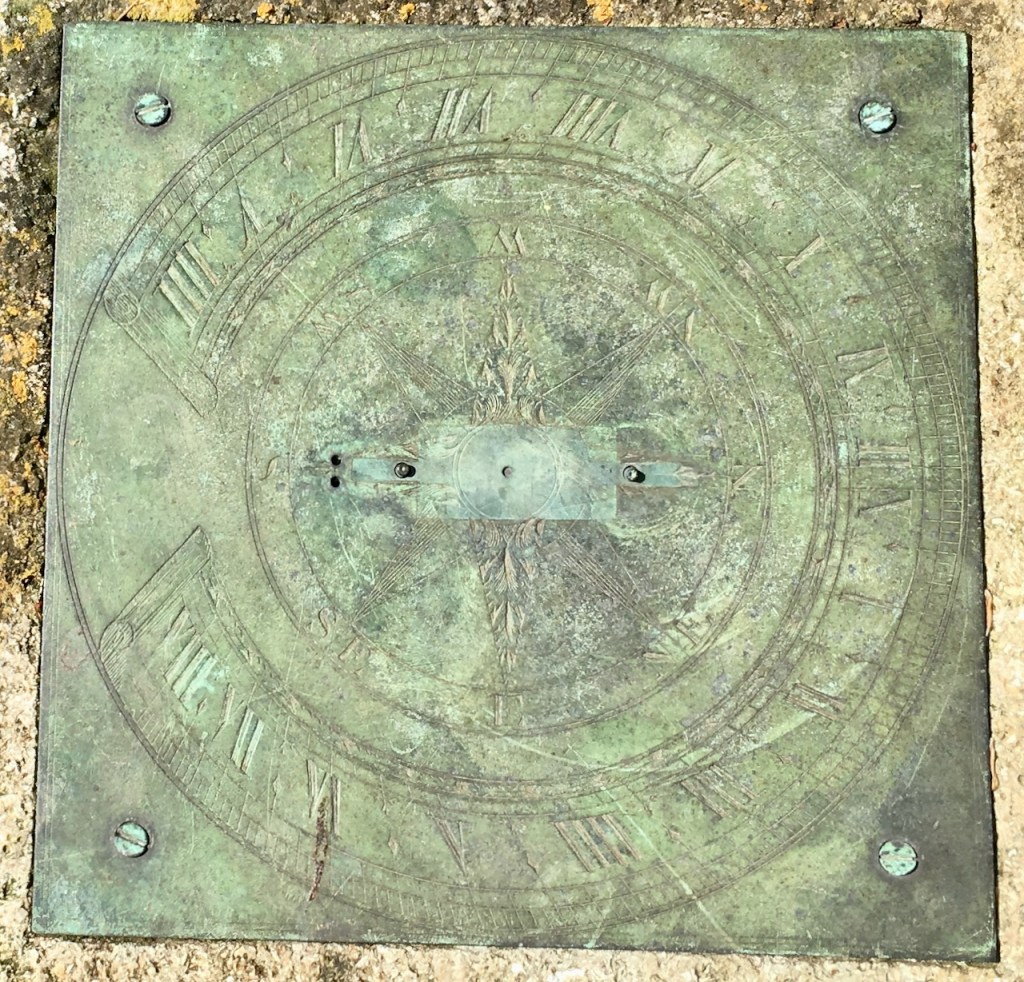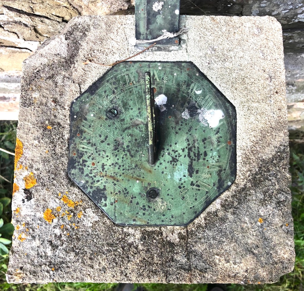 Horizontal dial in the churchyard. It seems unlikely to date from 1712 and I can’t find the motto Thyme Paseth elsewhere (it’s not in MG). It is a pretty design with a nice coloration.