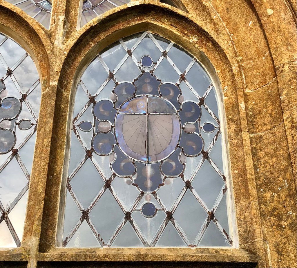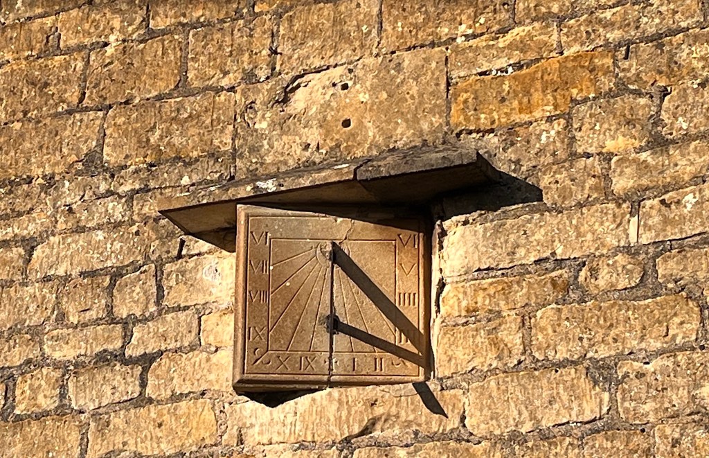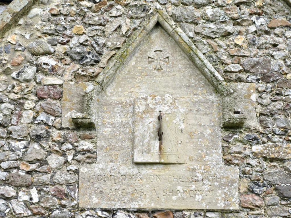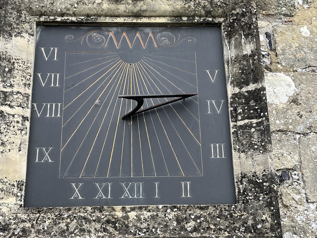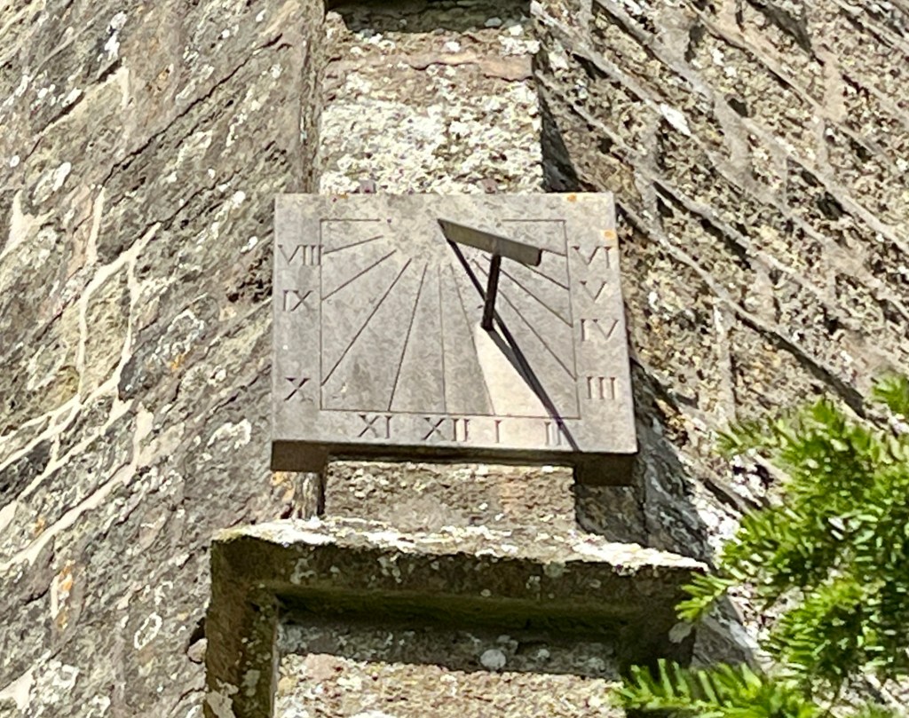 Horizontal dial in the churchyard. It seems unlikely to date from 1712 and I can’t find the motto Thyme Paseth elsewhere (it’s not in MG). It is a pretty design with a nice coloration.