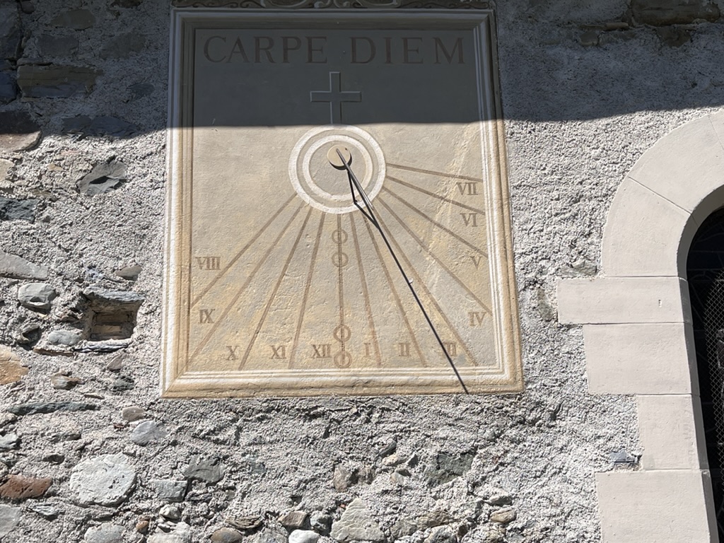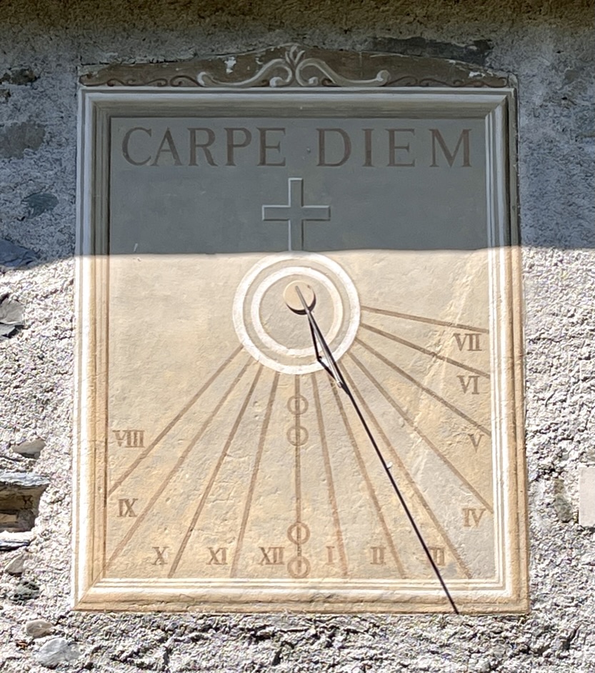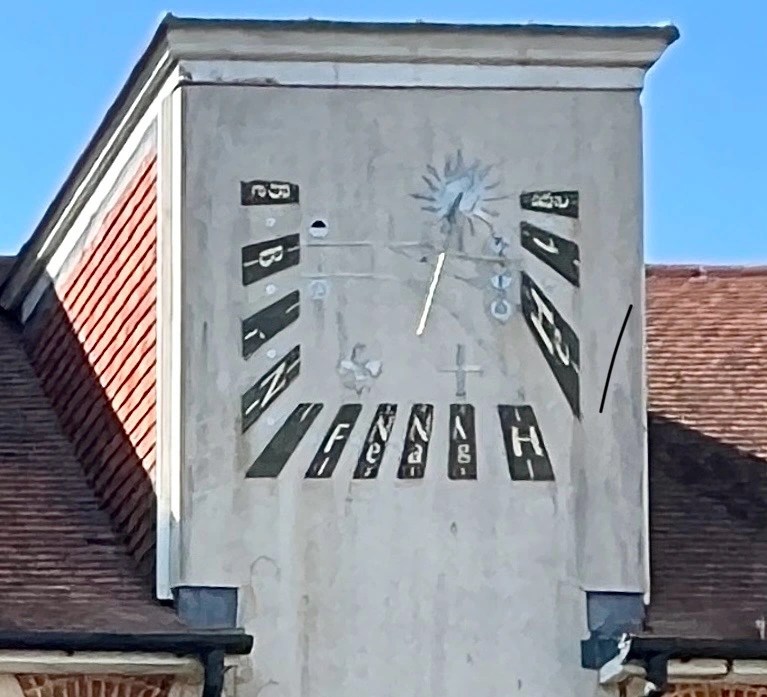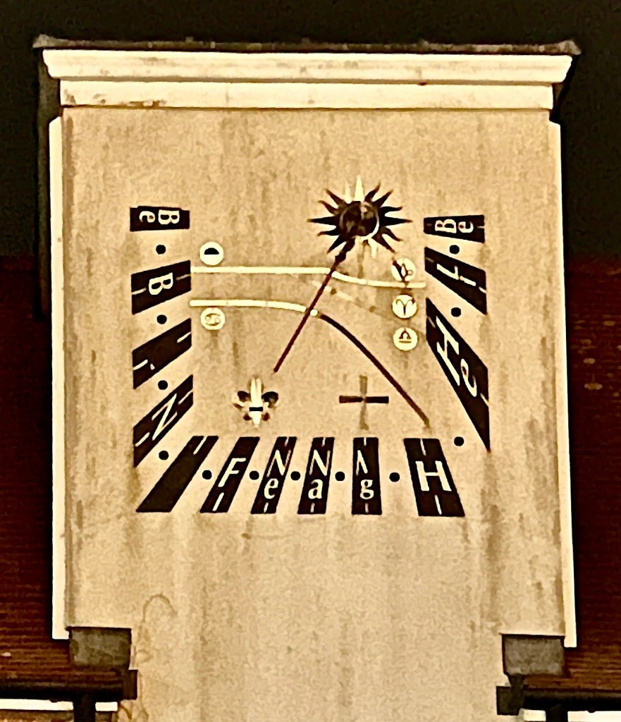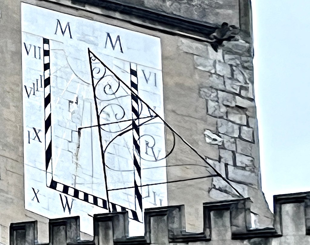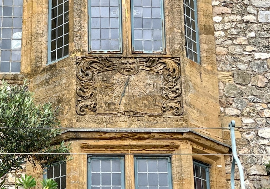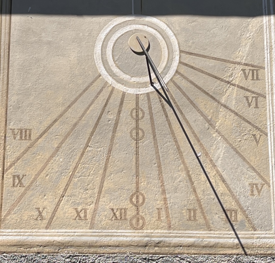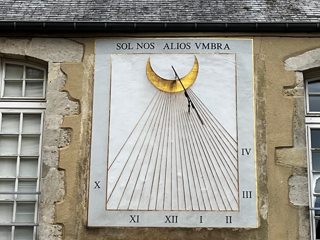 A modern dial on the facade of the Musée départemental d’Art Religieux, close to the fine Cathedral. Painted on rendering. A somewhat selfish motto Sol nos alios umbra (for us, sunshine; for everyone else, shade).