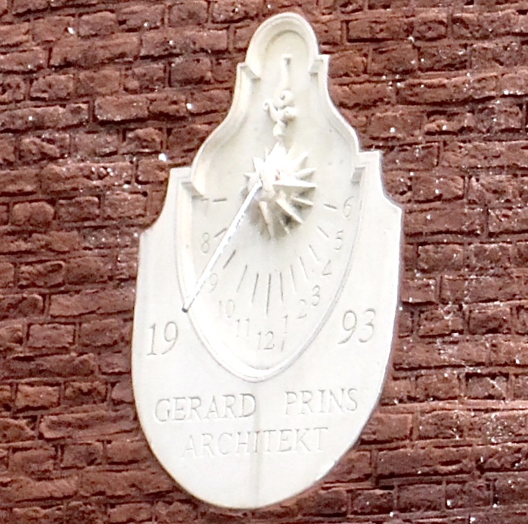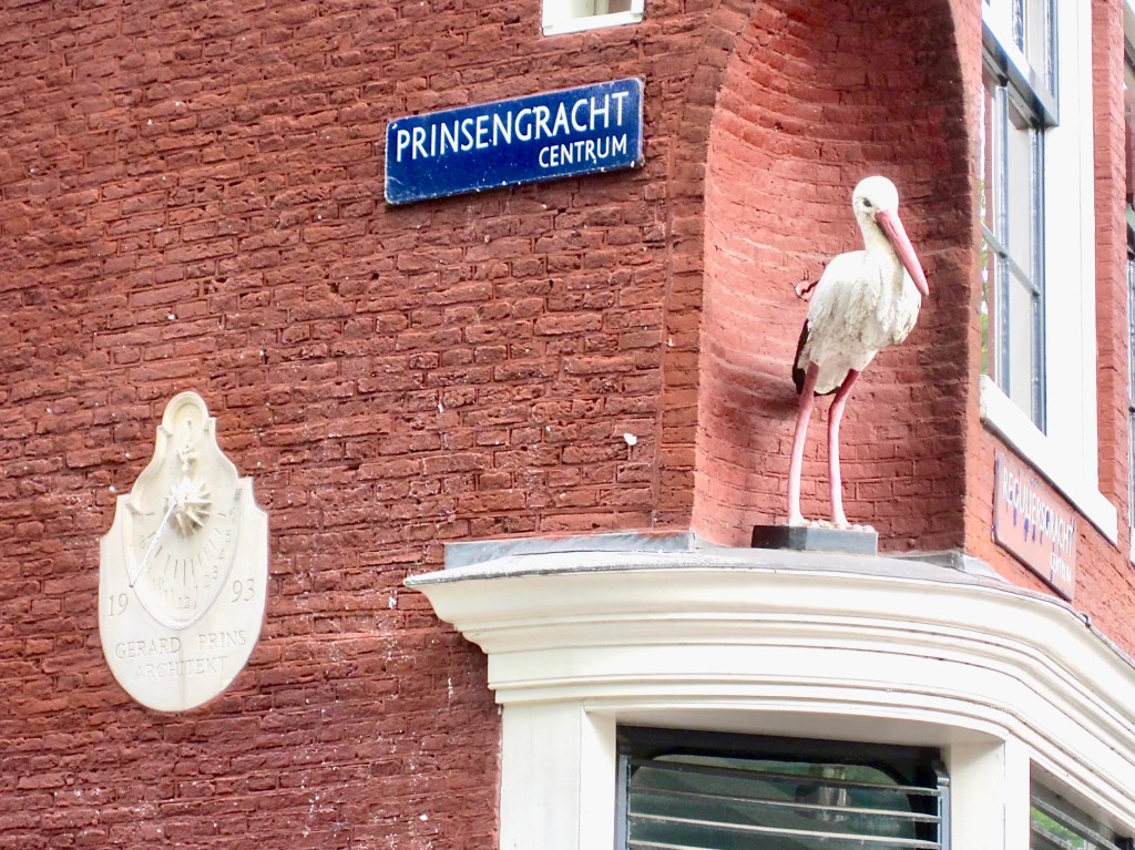 An attractive memorial dial (1993) on a street corner by a canal, with a stork for company