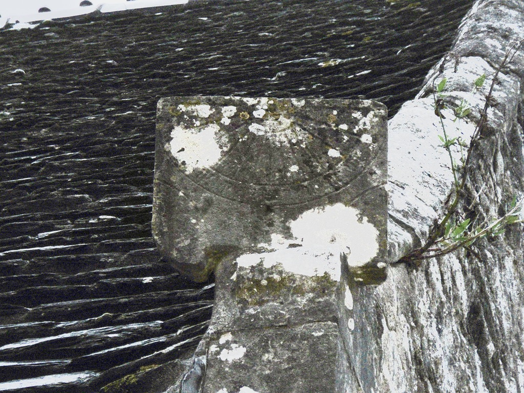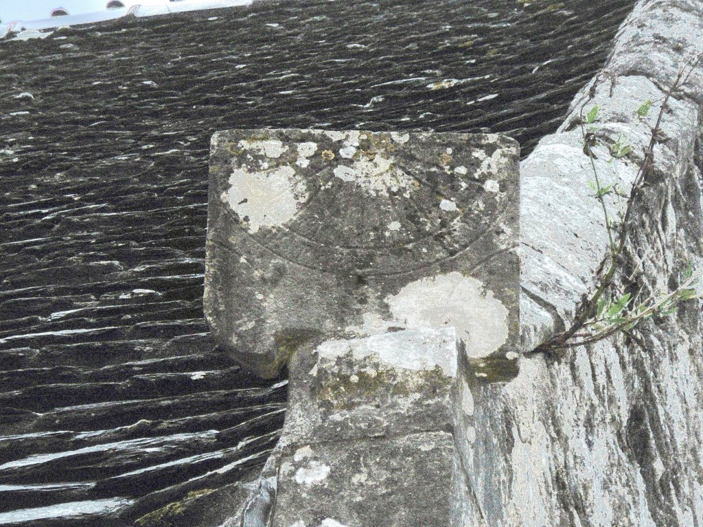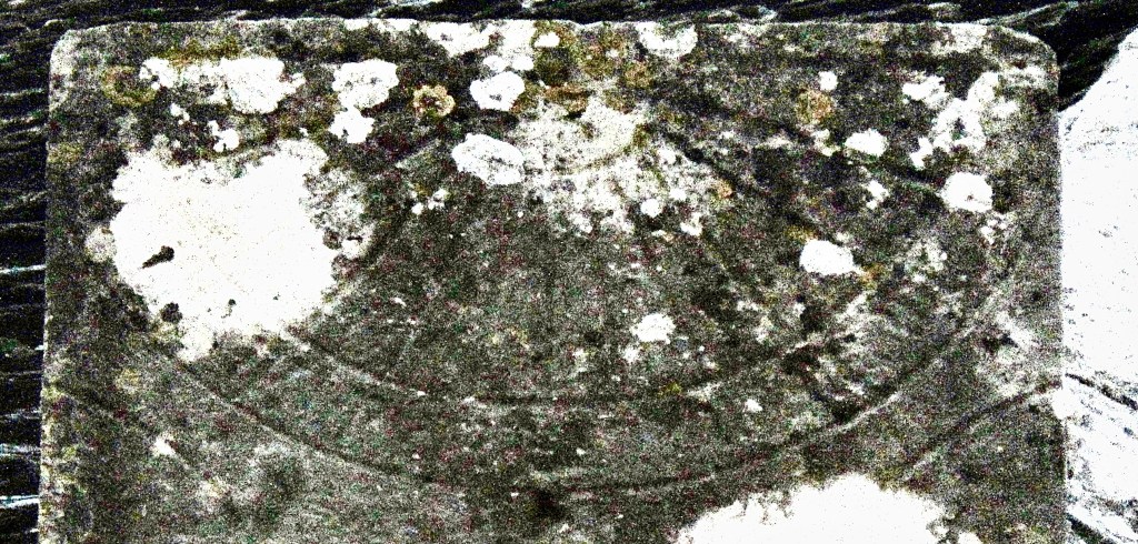 The dial is within the porch to the right of the doorway. It is encircled. The whole left half is now very faint. The clear straight line RHS at 3 extends beyond the circumference, suggesting that mid-afternoon marked the significant time of the day. Above it, at 6, a scratched rustic ‘line’. Just below there’s a near-obliterated straight line. With some imagination, there may even be a trace (see close-up) of a noon line. At some stage a copper rod has been used as a gnomon, with the blue coloration spreading below.