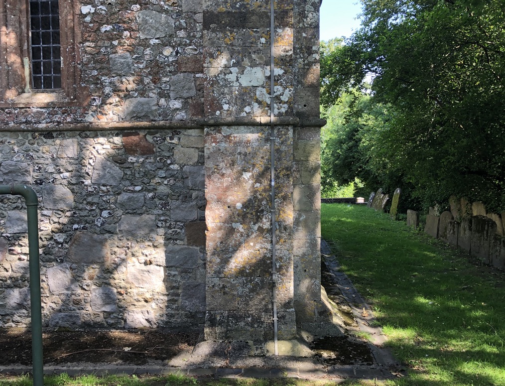 On the 4th quoin up on the E end, amidst some dead ivy stalks, there’s a further dial candidate. There are 3 noticeable lines and faint traces of a couple more. There is a plausible style hole at the apex of the lines. At the time I wondered whether the design should be awarded dial status. Having examined the photos I now think it should be. All the main criteria are met (location, position, radials, style hole). Luckily the driller has not plied his trade here.