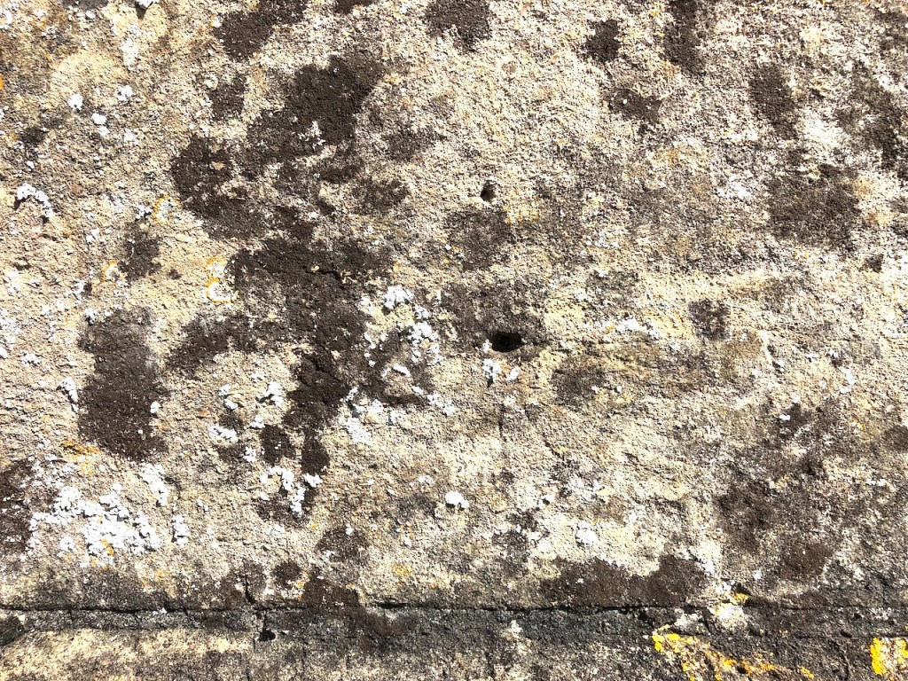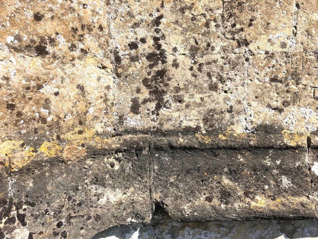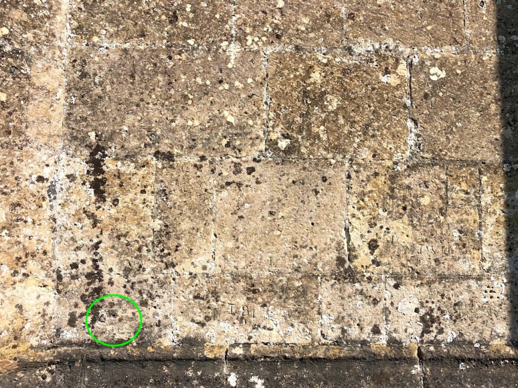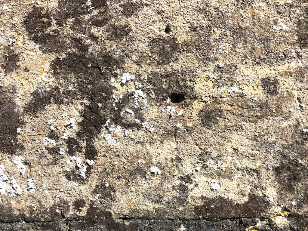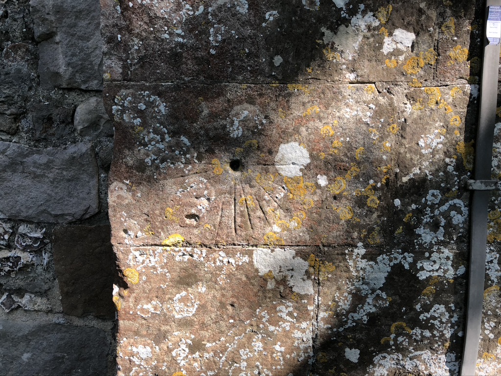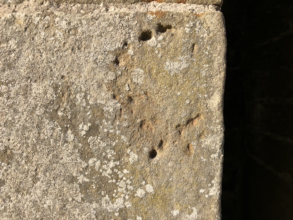 Erosion and lichen obscure the finer details. BSS records 7 lines but a close-up photo in sunlight reveals about a dozen, with possibly some shorter lines (half-hour marks?). There are also pocks, 2 or 3 of which could relate to the dial – in particular the 2 ‘terminal’ ones adjacent to the noon line just above the mortar.
