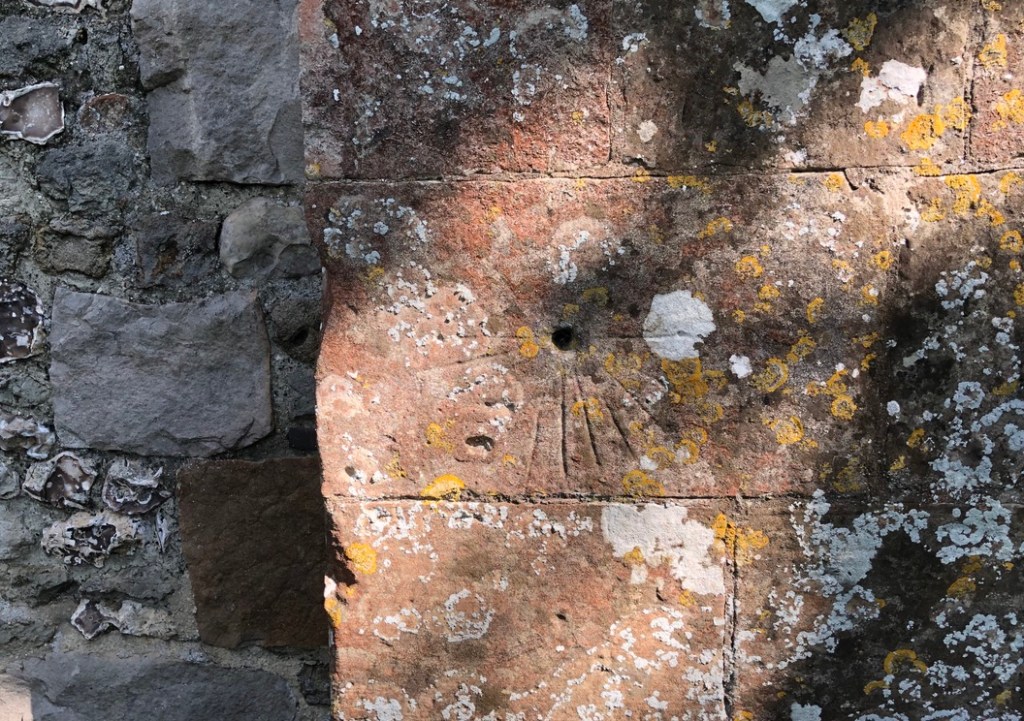 On the R. side of the S. porch, on the stone below the architrave. The stone below has marks that are probably apotropaic. 3 definite lines descending from the mortar line and through a slanting line that looks most like a fault in the stone – that may also apply to the 4th ridged line on the left side, or perhaps it was cut / added at a different time.