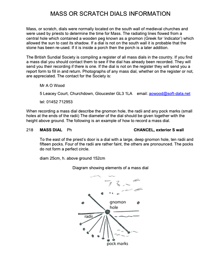 The range of mass dials is extensive and the designs reflect the knowledge of the individual parish priest in their varying complexity. The British Sundial Society now keeps a register and supplies mass dial recording forms on its website (see Acknowledgements).