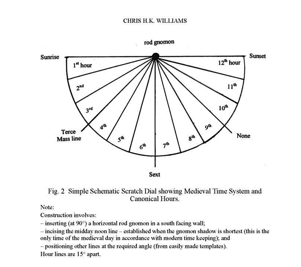 As You Like It, quoted by E C Chancellor in a Paper in 1936 to explain the difference between ‘modern time’ as measured by clocks from C14 on; and medieval ‘time of day’ as indicated by scratch dials. The latter system, lasting from approximately C12 to C16 (and locally beyond that), indicated the progress of the day. The most significant period would have been between sunrise and noon, which explains why the simplest and early dials were marked in the lower left quadrant. The vertical noon line on both dials and clocks would be the only point when ‘o’clock and ‘o’day’ coincided. That fact apart, a dial recorded the period from sunrise to sunset. The daily needs of a medieval community to watch the progress of the day and to mark the times for Mass were fulfilled by approximation rather than precision. Strict accuracy was not essential, and anyway local ‘time keeping’ would have varied according to the routines of each local community. Finally, it’s worth noting that dials would ‘work’ crudely in any season, dawn and dusk being the primary indicators.