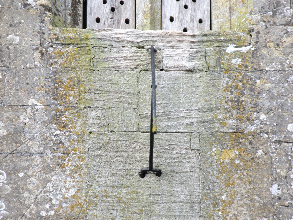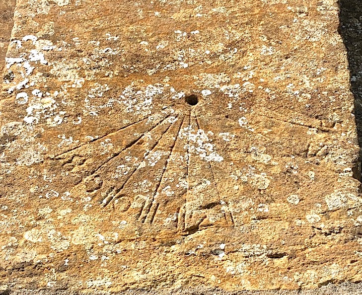 However one chooses to describe the dial, it is clearly a sophisticated and ambitious design. Early scratch dials do not have numerals, generally just a style hole with lines, pocks or both, and often crude and rather random. Gradually they became more complex and cut more accurately, in a few later examples with the addition of Roman numerals. Very few scratch dials have Arabic numerals. There’s a most intriguing one at MONTACUTE Somerset, where the dial has a mix of Roman and Arabic numerals. One could argue a true scratch dial had a single rod in a hole to cast the shadow, and that a dial requiring a more elaborate iron gnomon attached to the face takes it out of the category of scratch dial. This dial was clearly designed for such an arrangement. In that way it differs from eg Litlington and ALFRISTON (E Sussex) where iron gnomons were added onto the face of an existing scratch dial.