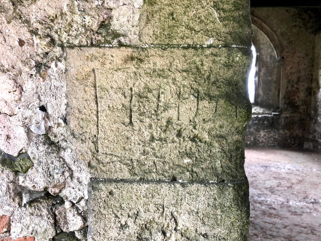 A selection of church marks in the porch. The 2 compass-drawn circles are not dials but [probably] ‘demon traps’. In superstitious medieval times it was believed that evil could be prevented from entering the holy building with protection marks. In this type, evil would become trapped within the never-ending circle. The VV and the M on the wooden door are Marian marks standing for the Virgin Mary, who bars entry to the church by evil.