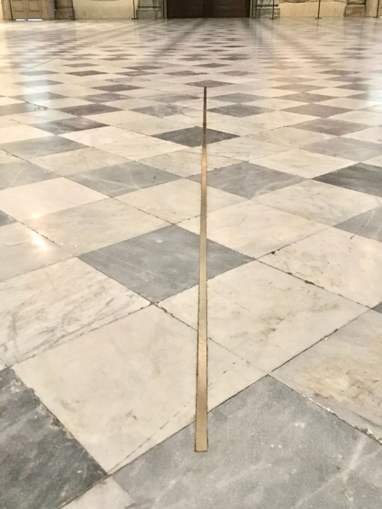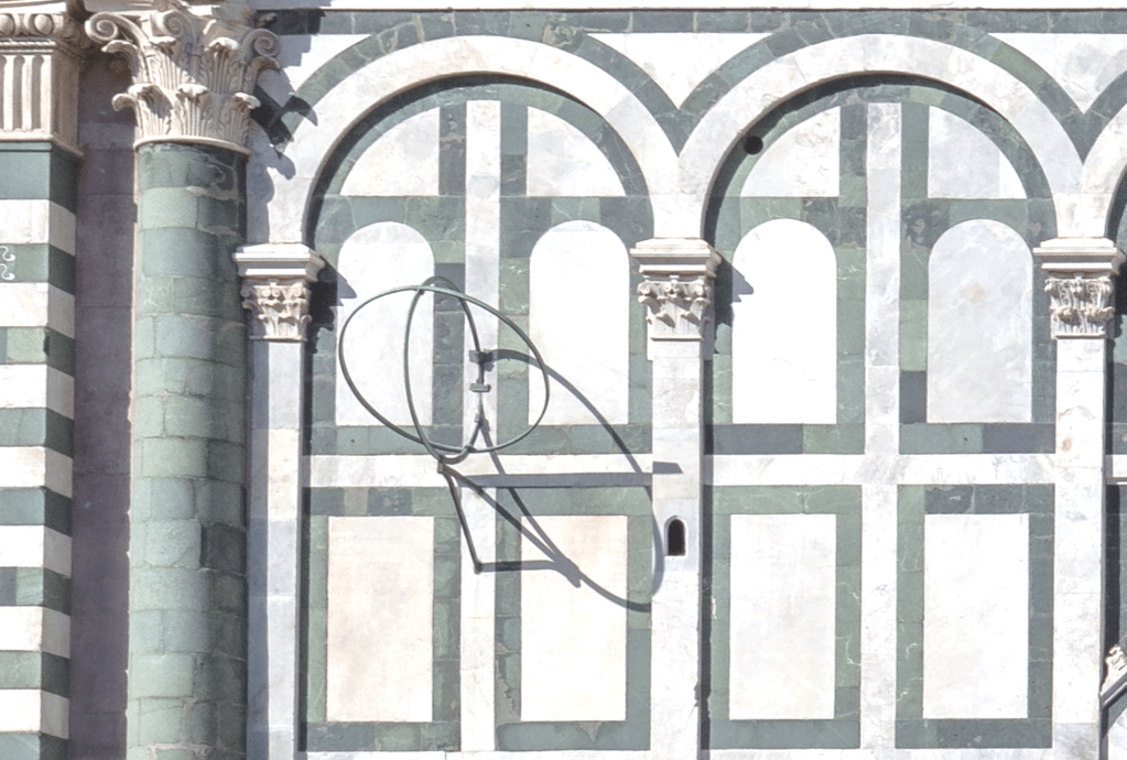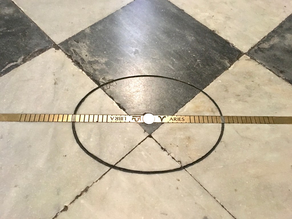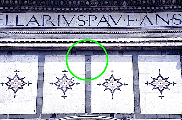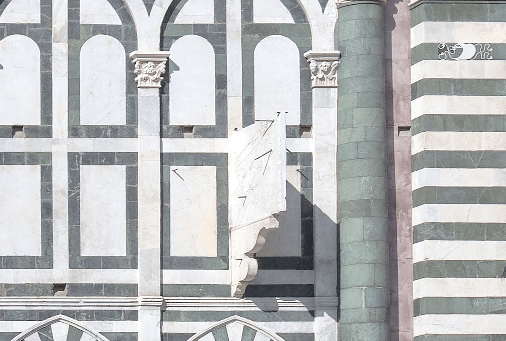 Meridian Dial: Although Danti designed the dials he was unable to complete the tracing of the meridian line on the floor of the church. He only opened gnomonic holes, first in the glass of the rose window, then on the church’s façade, much higher, and made two openings in the vaulting as well, through which rays of light would pass only during the equinoxes and the winter solstice.