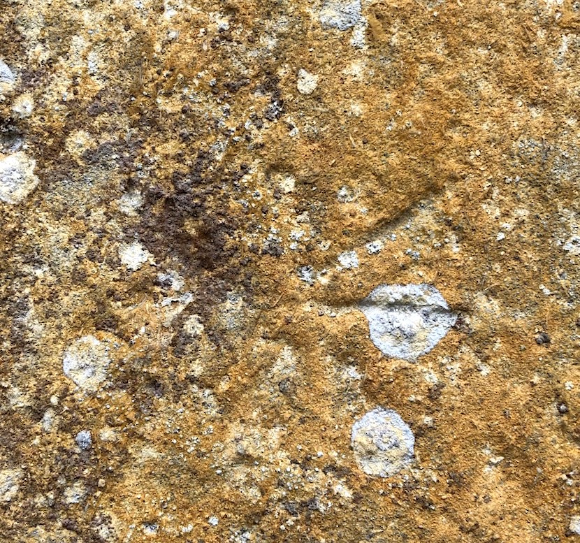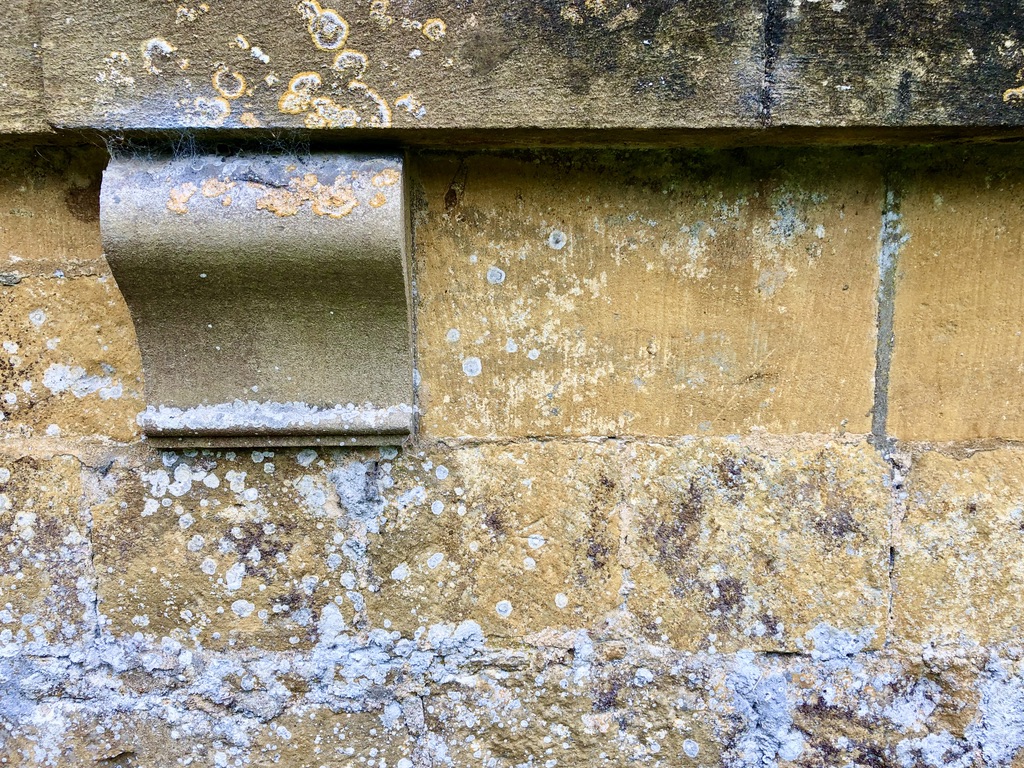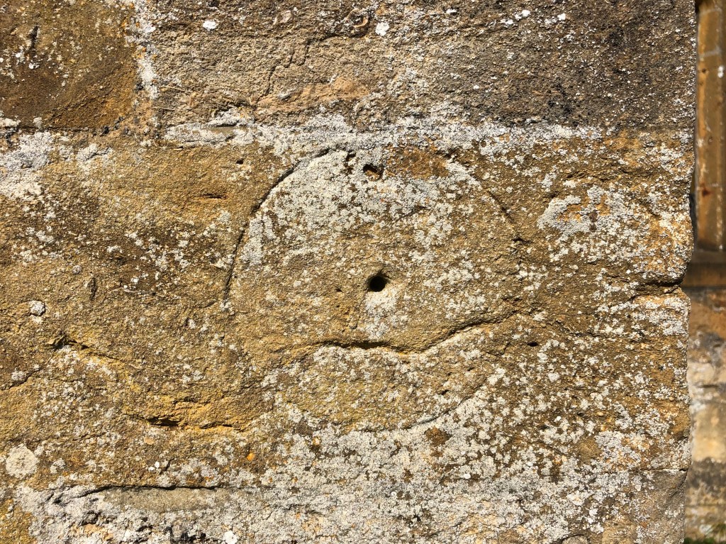 My thoughts are that this is a small, simple dial cut on an older-seeming stone; that it has been relocated, presumably from the S. front; and that it has been rotated 90º anticlockwise. There’s the hint of a filled style hole below the dark patch that looks different from the lichen.