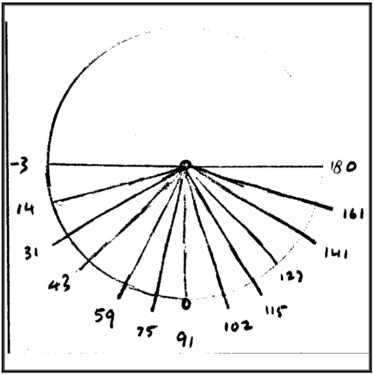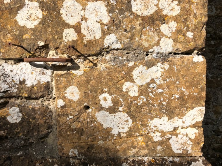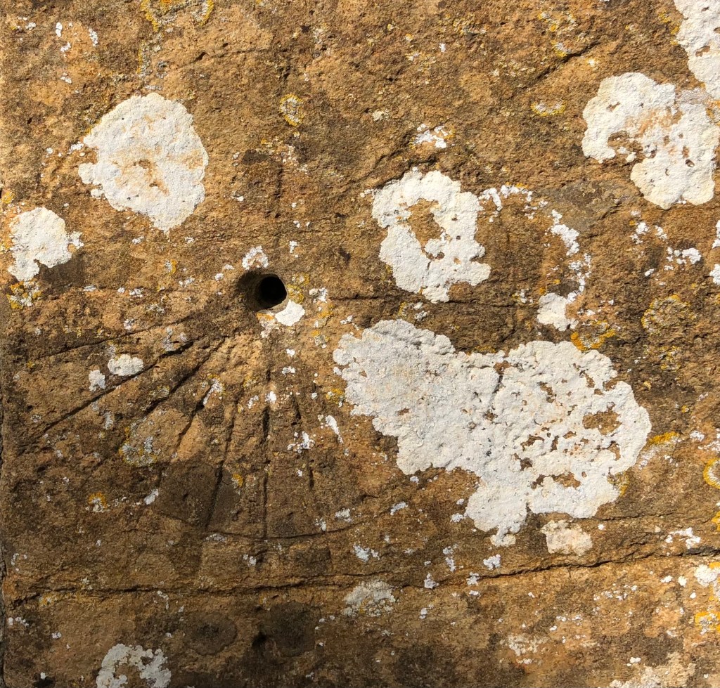A return to Hermitage to check for other church marks / graffiti produced an unexpected reward – a second dial, hitherto unnoticed and unrecorded, on a quoin stone at the W. corner of the S. side. In strong sunlight, it was clearly visible through a coating of lichen.