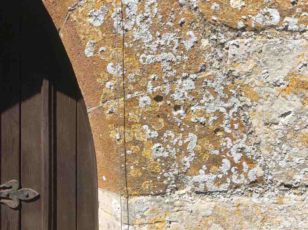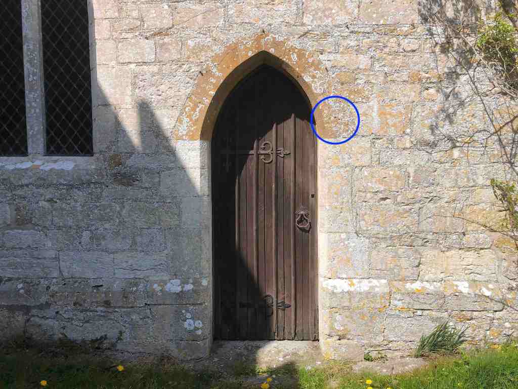 The dial is at eye-level on the quoin of the buttress between the porch and the Chancel door. It is not recorded, and I can see why (a) it may have been overlooked and or (b) why, if noticed, it may have discounted as a definite dial. So I’ll argue the case.