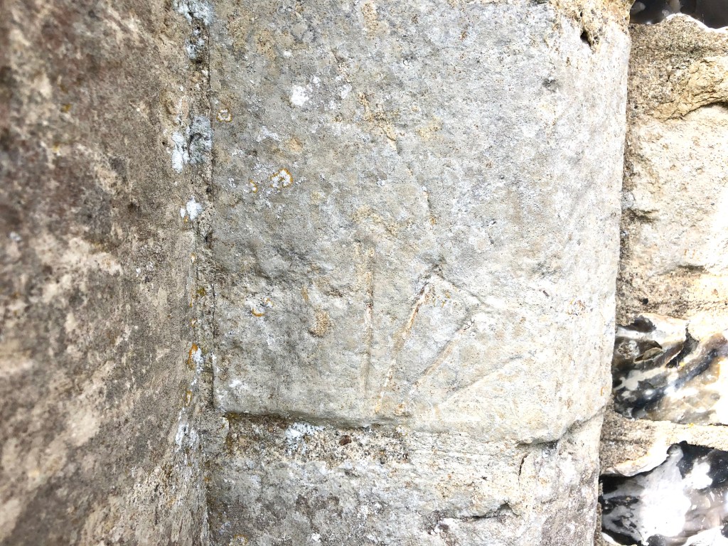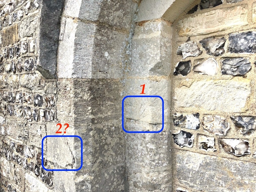 Close to the featured scratch dial recessed inside the blocked doorway, there is a larger stone on the outer jamb with a possible second dial. There are 2 clear radials converging on the mortar line, one long and one shorter. If a second dial, it is also inverted. It seems later than its companion. The amount of obvious reworking of the doorway area over time might explain the move of the dial stone.