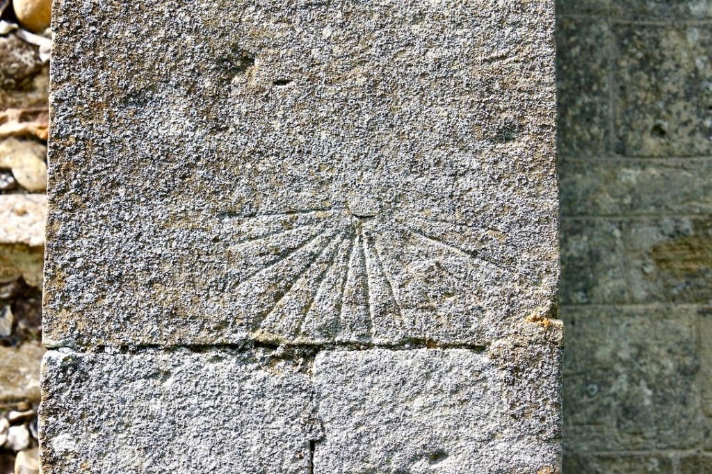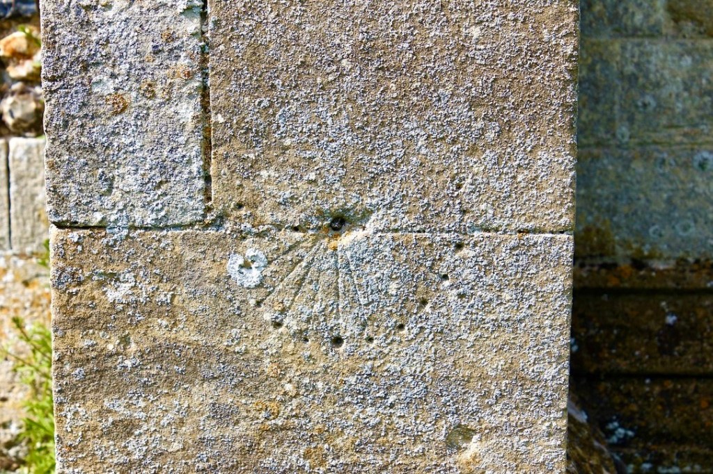 The dial is high up (c 3m) on the chancel quoin stone SE corner. GLP dates to C13. Semi-circular (a hint of a complete circle?), with 13 lines. Some terminal pocks. One line – corresponding with Terce – is deeper incised, with a hole outside the circumference.
