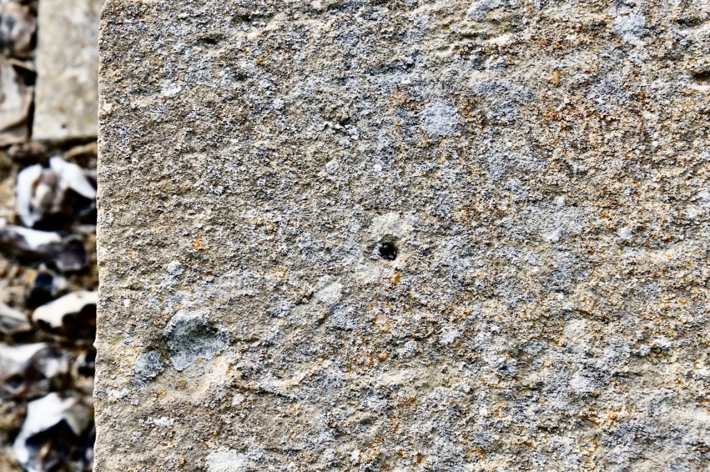 Dial 2 has 12 lines radiating from a plugged gnomon hole. There are no pocks. There’s minor puzzle: which is the noon line? The deepest cut line is the seventh line from the LHS horizontal rather than the sixth, and slightly offset to the right. In addition, 3 or 4 lines seem cut off at the mortar line, suggesting a rearrangement of the stonework at some time. (It might also explain why Dial 1 is so low down on the buttress).