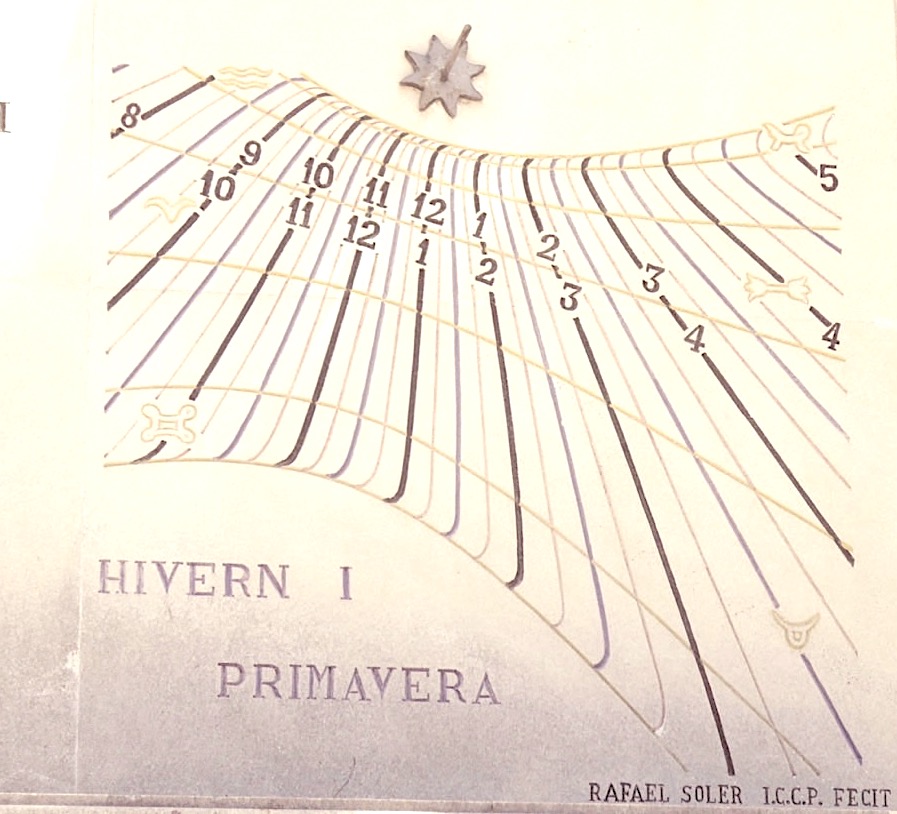 The two right-hand sundials are complementary and each covers two seasons. Presumably for a particular month, one dial will be reliable as to time and the ‘off-season’ one will not. The words are Catalan eg Hores Mitjanes = Mean Time; Estiu I Tardor = Summer and Autumn.