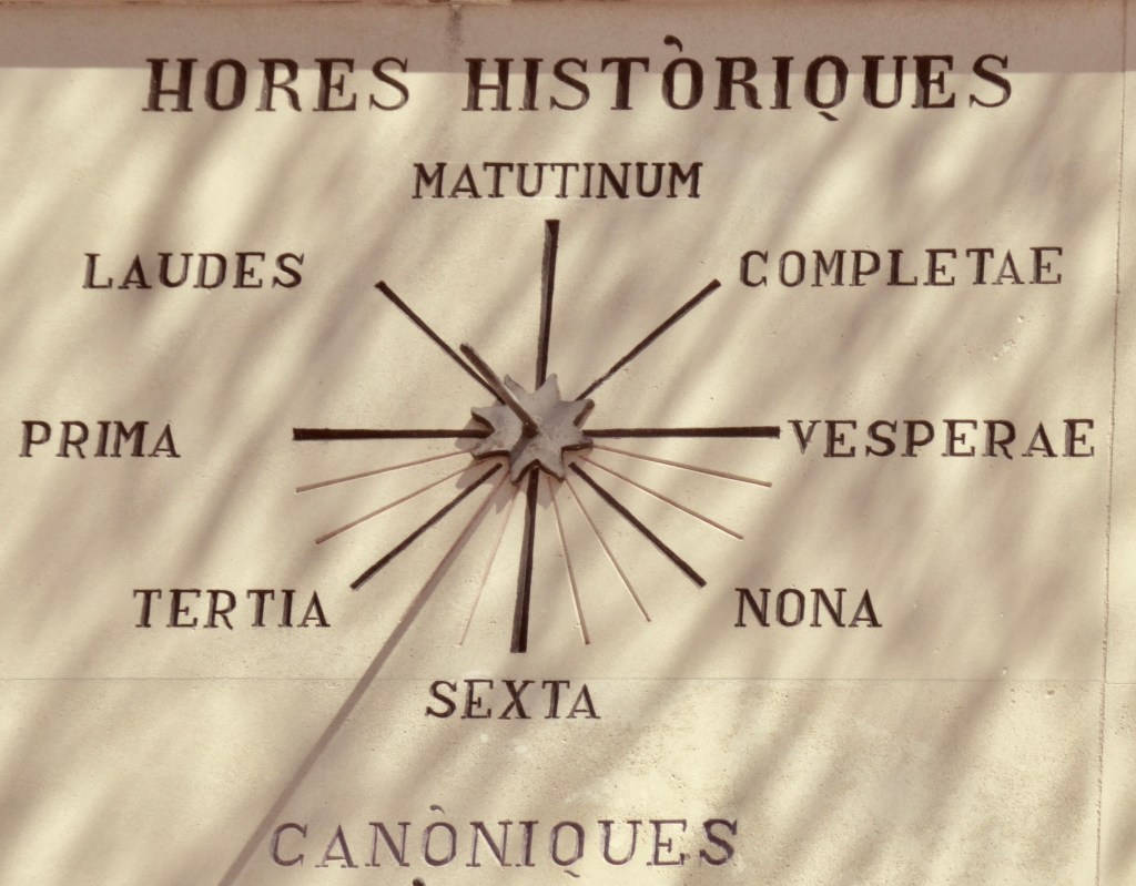 A short walk from the monastery, there is a path that leads up to a calvary and some great views. Along the way is an amazing multiple vertical sundial. It was designed by Rafael Soler, and carved in 1991. It displays with some style the evolution of sundials from medieval to modern. There are two historical dials, one solar dial, and two seasonal dials.
