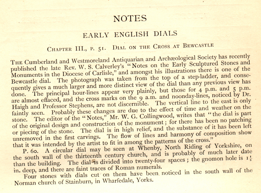 The oldest surviving English tide dial is on the 7th- or 8th-century Bewcastle Cross… carved on the south face of a Celtic cross… and is divided by five principal lines into four tides. Two of these lines, those for 9 am and noon, are crossed at the point. The four spaces are further subdivided so as to give the twelve daylight hours of the Romans. On one side of the dial, there is a vertical line which touches the semicircular border at the second afternoon hour. This may be an accident, but the same kind of line is found on the dial in the crypt of Bamburgh Church, where it marks a later hour of the day. The sundial may have been used for calculating the date of the spring equinox and hence Easter.