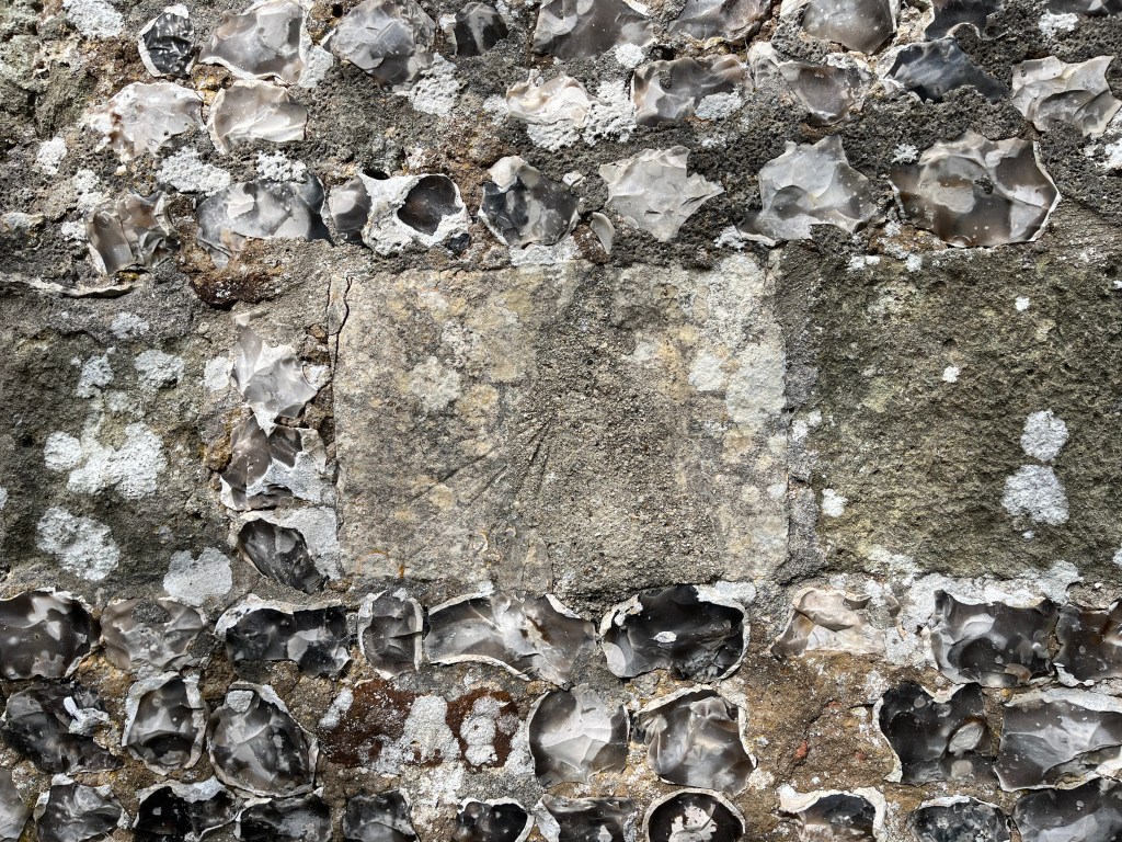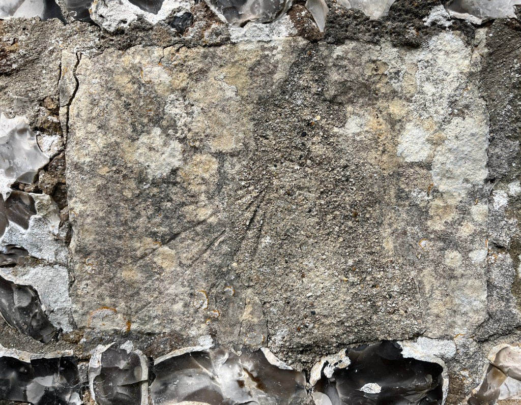 An attractively simple dial set in flint, perhaps not its original location. There are 6 lines LHS from the horizontal (6) down to to 11. Two are very faint. A morning dial, with 2 slightly deeper cut / longer lines suggesting Nones as the main time for observation. The absence of an obvious gnomon hole – open or filled – is a puzzle. There is a slightly paler area where the radials converge, perhaps marking the site of a gnomon hole filled centuries ago, now worn to a smooth patch