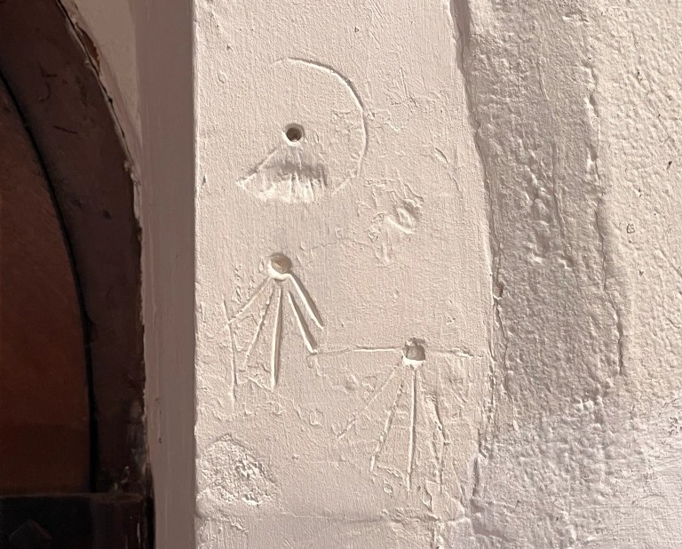 These 3 dials are closely grouped on a single stone on the north face of the west jamb of the south doorway. It would be interesting to know where they were originally located, and when / why they were moved to their present position with a purely decorative function.
