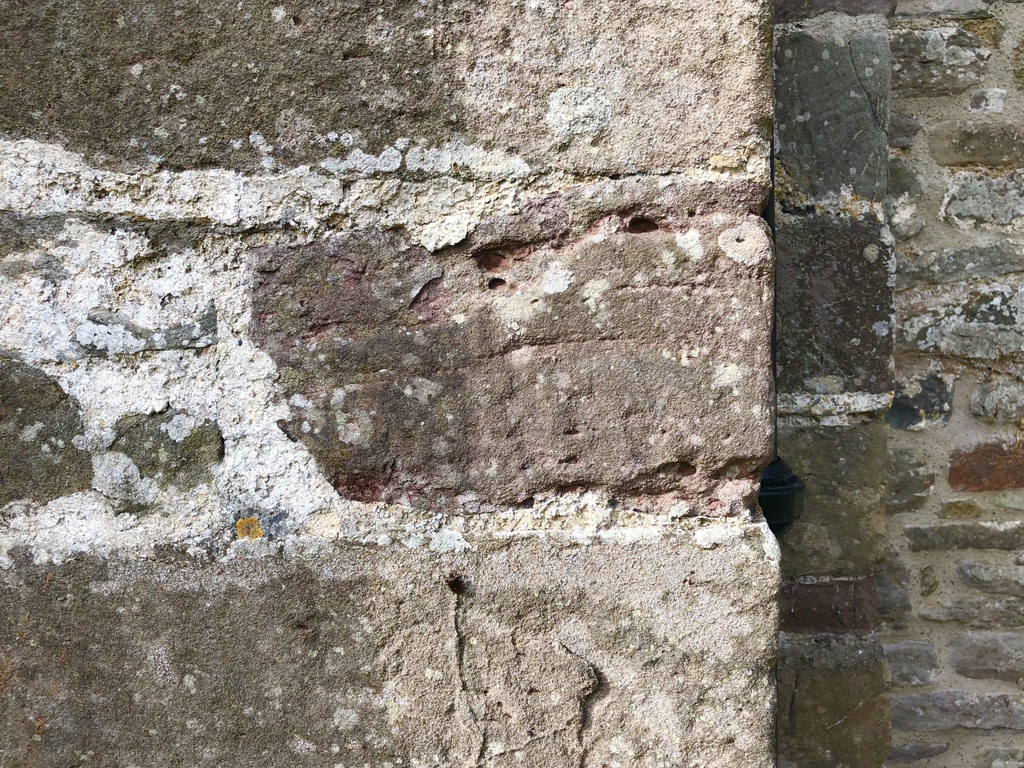 To the right of the E. buttress on the E. end, there is a darker reddish stone, of a type seen elsewhere in the stonework, that caught my eye. There were 2 distinct long downward lines from an apex where there might credibly be a style hole. My photos don’t show the stone and markings as clearly as they looked to the eye. I immediately thought it was a probable dial. If so – given its position – the stone was undoubtedly relocated during reconstruction. I leave these images as food for thought. Comments are welcome.