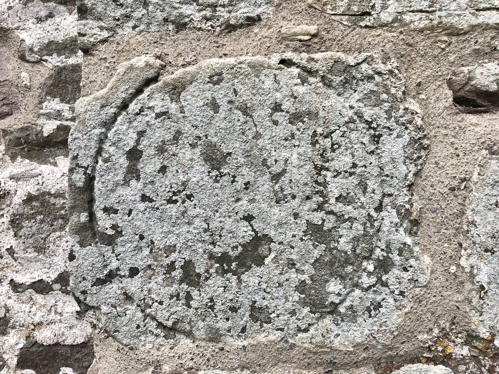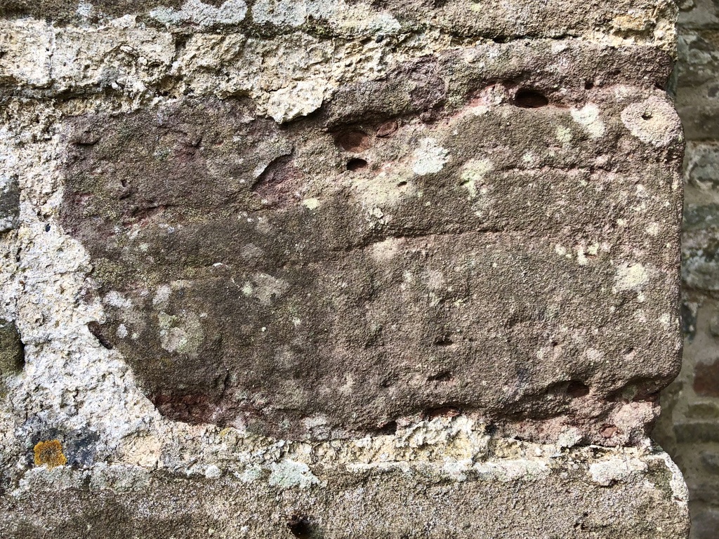 The dial, a large circle, is on a short buttress under the E. window. There are few detectable marks, not least because of the lichen that covers most of it. The presumed style hole is basically a dimple in the centre. The present position – and indeed the history of the building – indicates relocation. It’s hard to say how useful it might originally have been, but it adds to the remnants of the church’s medieval past.