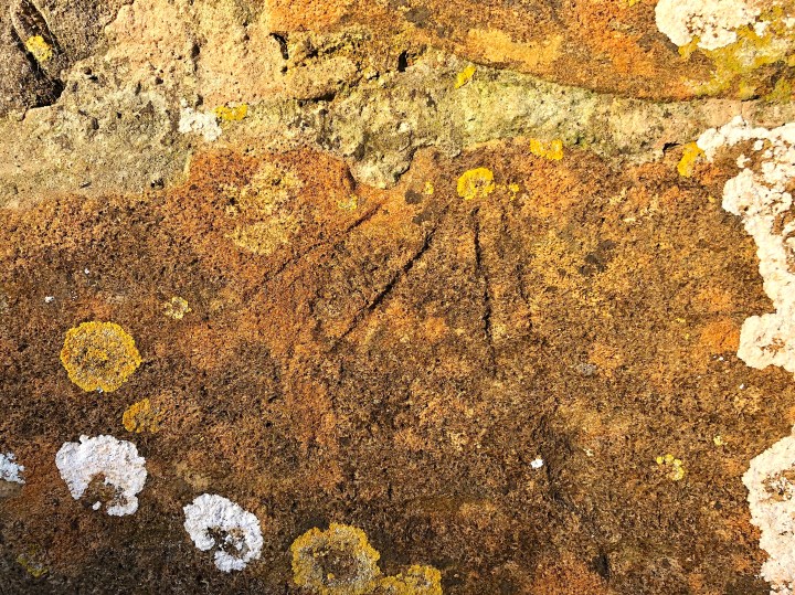This ‘new’ dial is also low down between the other 2, nearest Dial 1. It is inverted. There are 3 very clear lines of differing widths and depths, with the (upside down) noon line extending to the edge of the stone and ending in a (faint) cross noted by GLP. He mentions 6 lines (3 eroded) in all, and adds This dial would appear to record the Saxon ‘Tides’