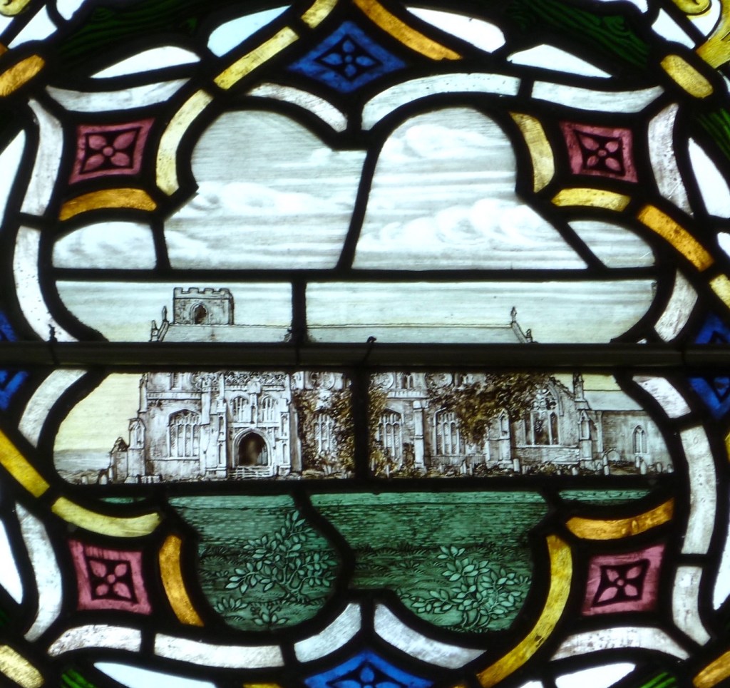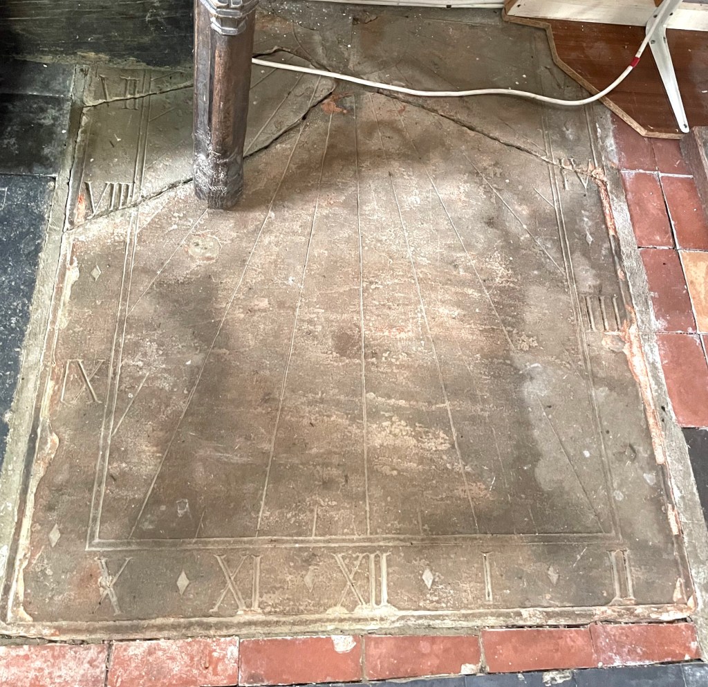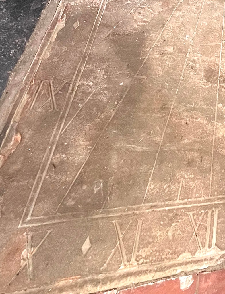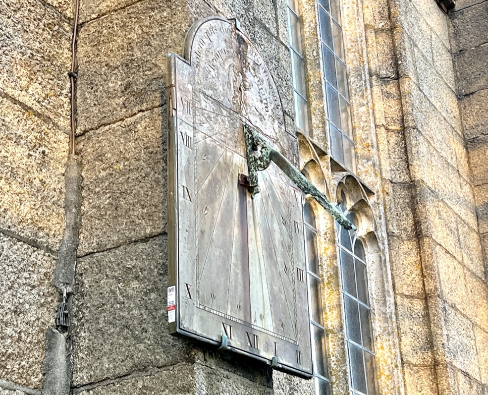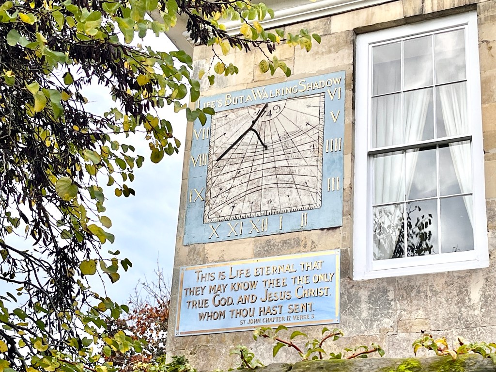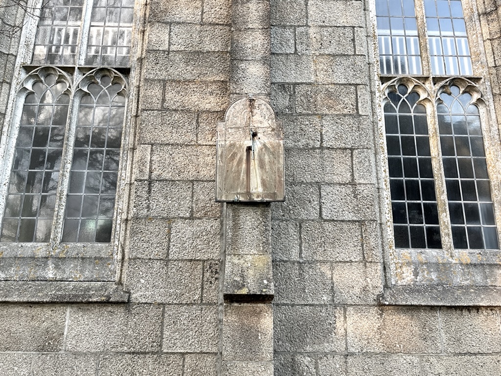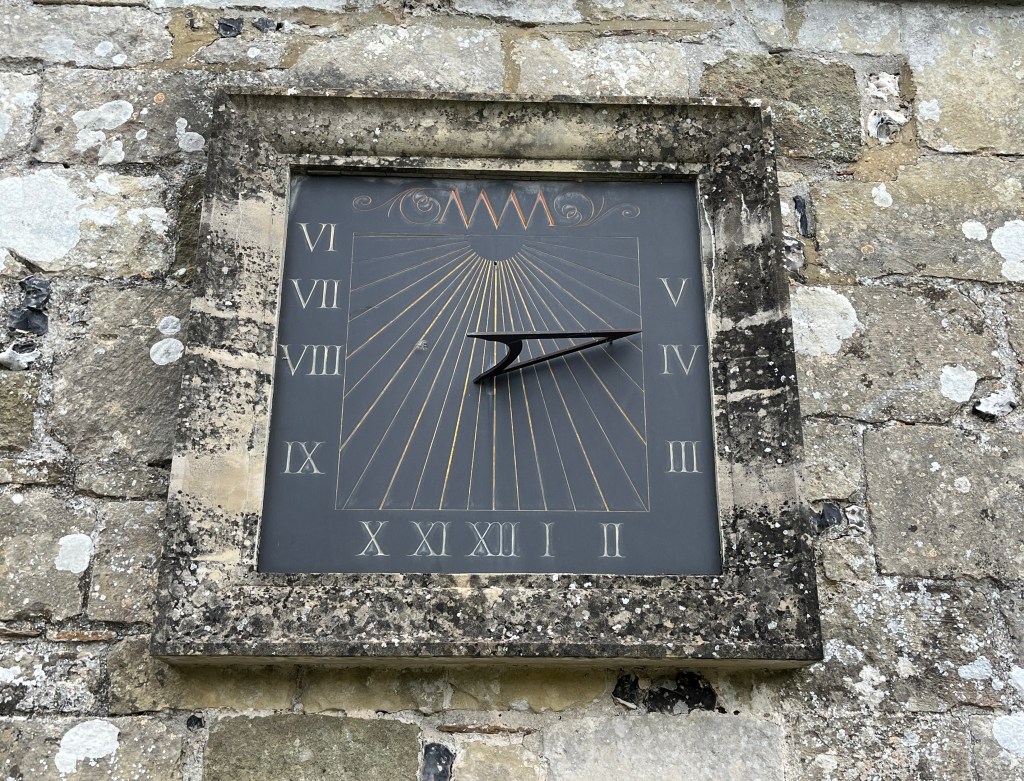 High up on the east tower, the dial is a good example of a sundial that (besides its primary use) acts as a memorial, and tastefully reflects the significance of the dedicatee. It is also very visible and easy to read at a distance. The lightly ornamental gnomon is moored at the bottom right corner as you face the dial. The style is simple, with 12 hours marked from 7.00am to 6.00pm and 24 radials to record half hours. The dial plate is white-painted wood. Overall the dial is in poor condition, but I gather that there are plans to carry out complete restoration during 2026.