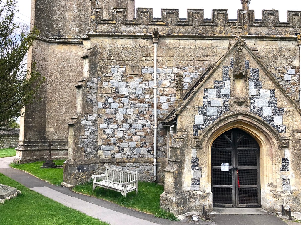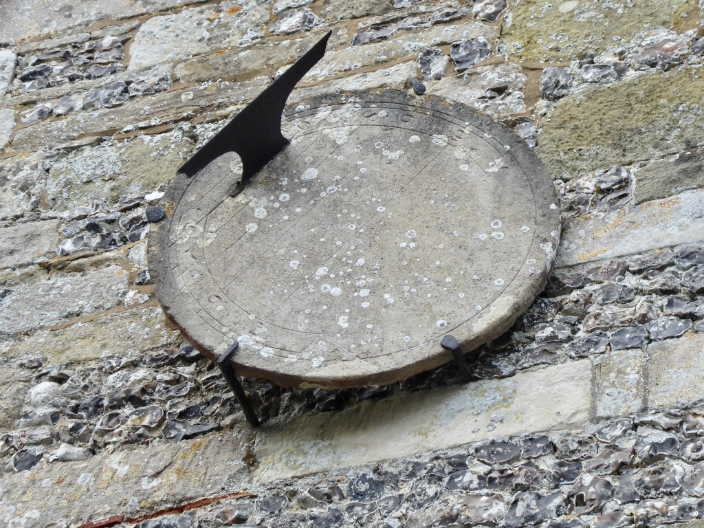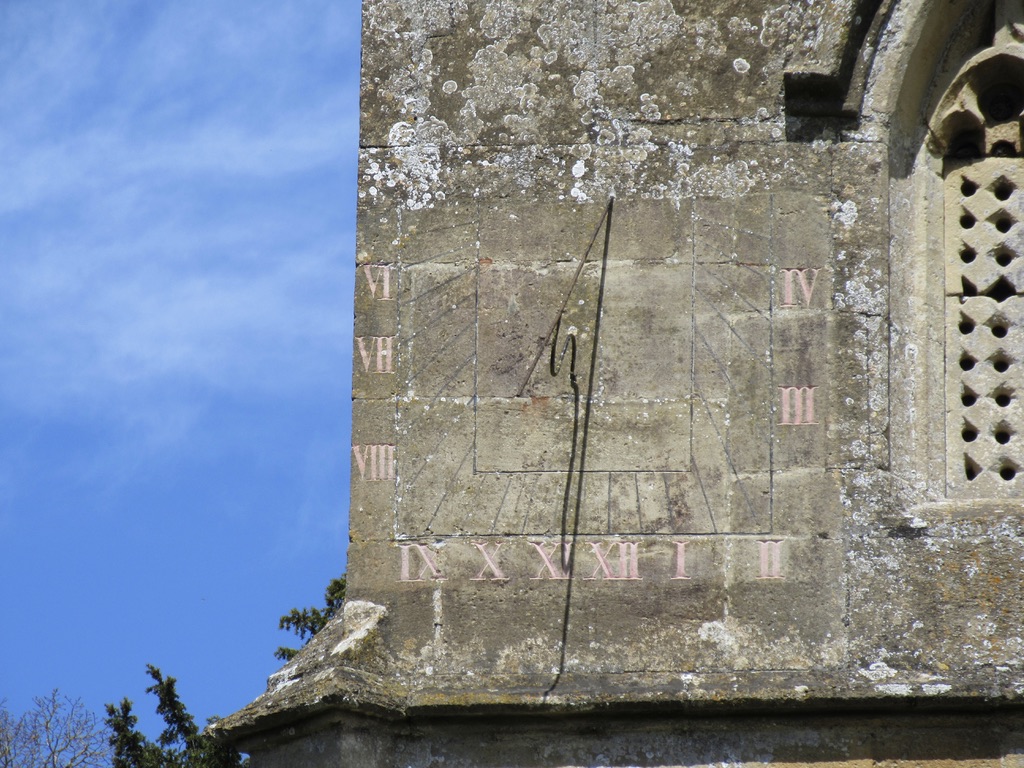 West Overton, 5m W of Marlborough, lies within the mystical area that includes Avebury, Silbury Hill, long barrows, tumuli, sarsens and so on. St. Michael was built in 1878, replacing an older church on the site. The Tower was completed last. High up on S side is a fine Victorian sundial complete with a motto in period lettering. The time scale shows 5am to 3pm in half and (some) quarter hours. The dial was restored in 2003, as detailed by the excellent SUNDIALS.CO, an eclectic site that no dialist should overlook.