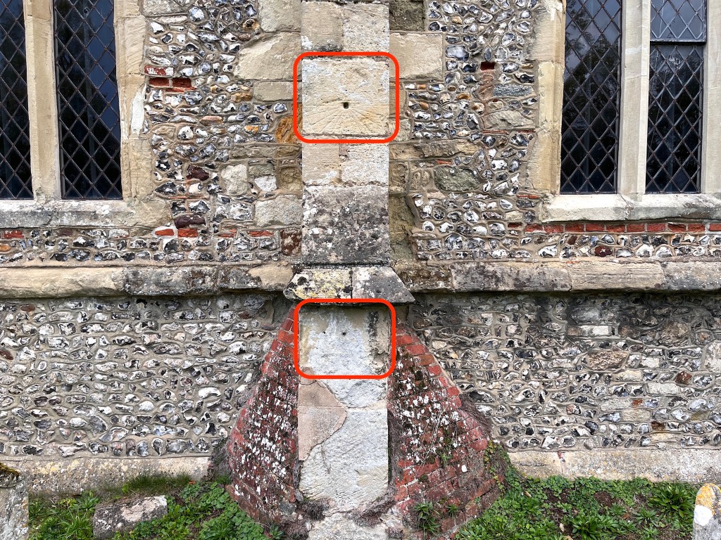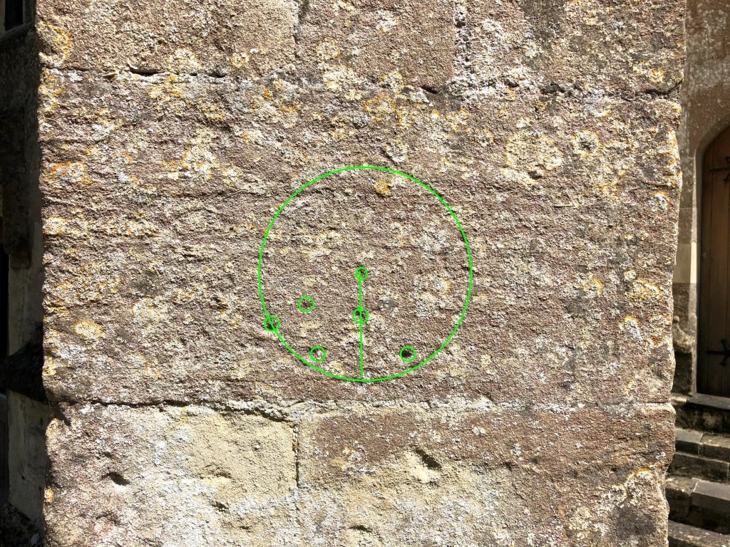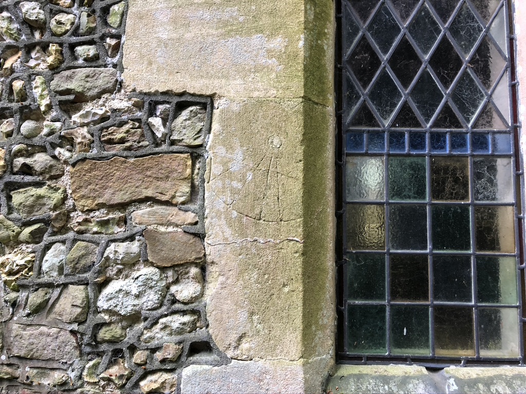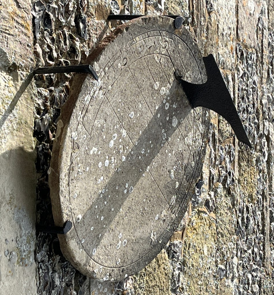 The dial was correctly delineated to face 38° east of south. The cast bronze gnomon fell off but was kept by the church wardens. Its original angle was incorrect, and it was set into a slot in the stone to compensate. Restoration involved re-engineering the gnomon and making new clamps to fix it. The dial itself was renovated [précis]